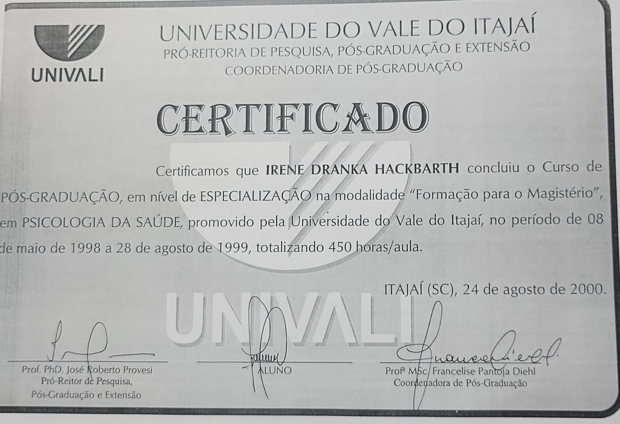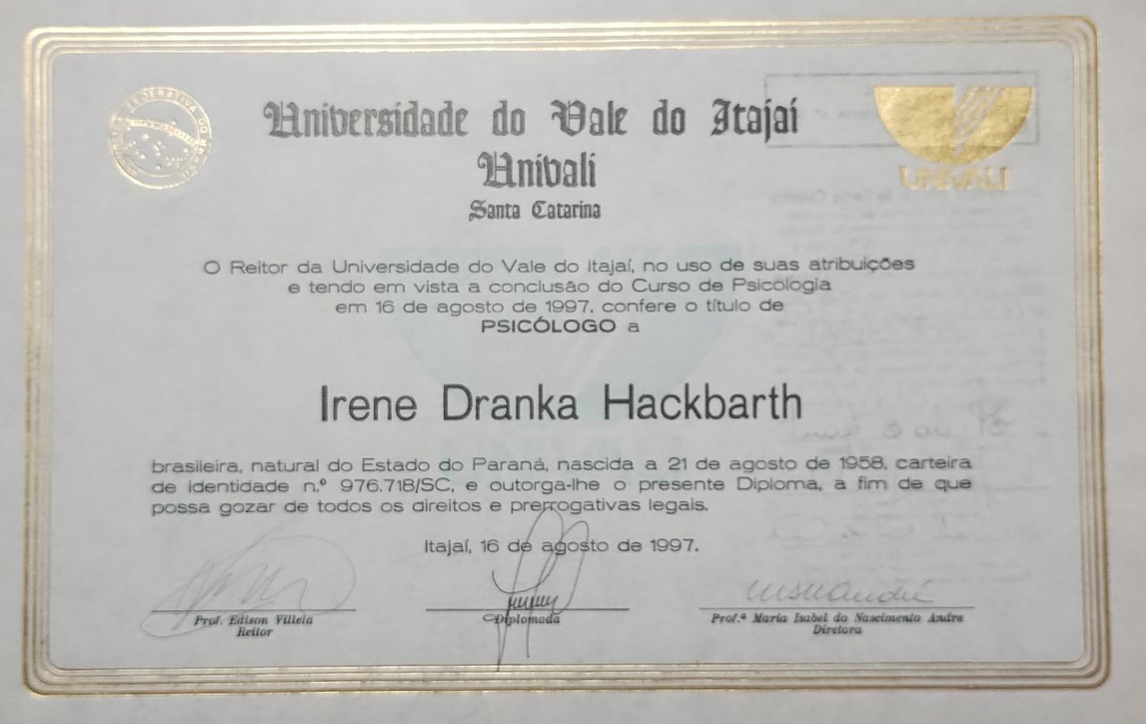 Sou psicóloga com quase 30 anos de experiência na profissão, formada pela Universidade do Vale do Itajaí (Univali),sou especialista em Psicologia da Saúde pela Universidade Federal de Santa Catarina (UFSC). Ministrei cursos e palestras pela CELESC no programa PPA (Preparação Para Aposentadoria), além de trabalhos em grupo para pessoas dependentes de álcool ou tabaco, bem como trabalhos motivacionais,de auto ajuda e fortalecimento de vínculos afetivos e profissionais.