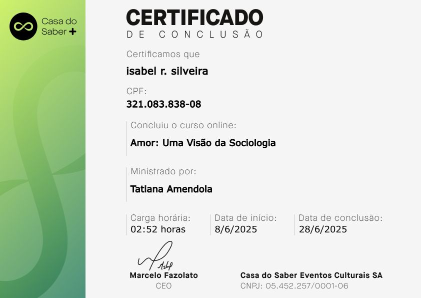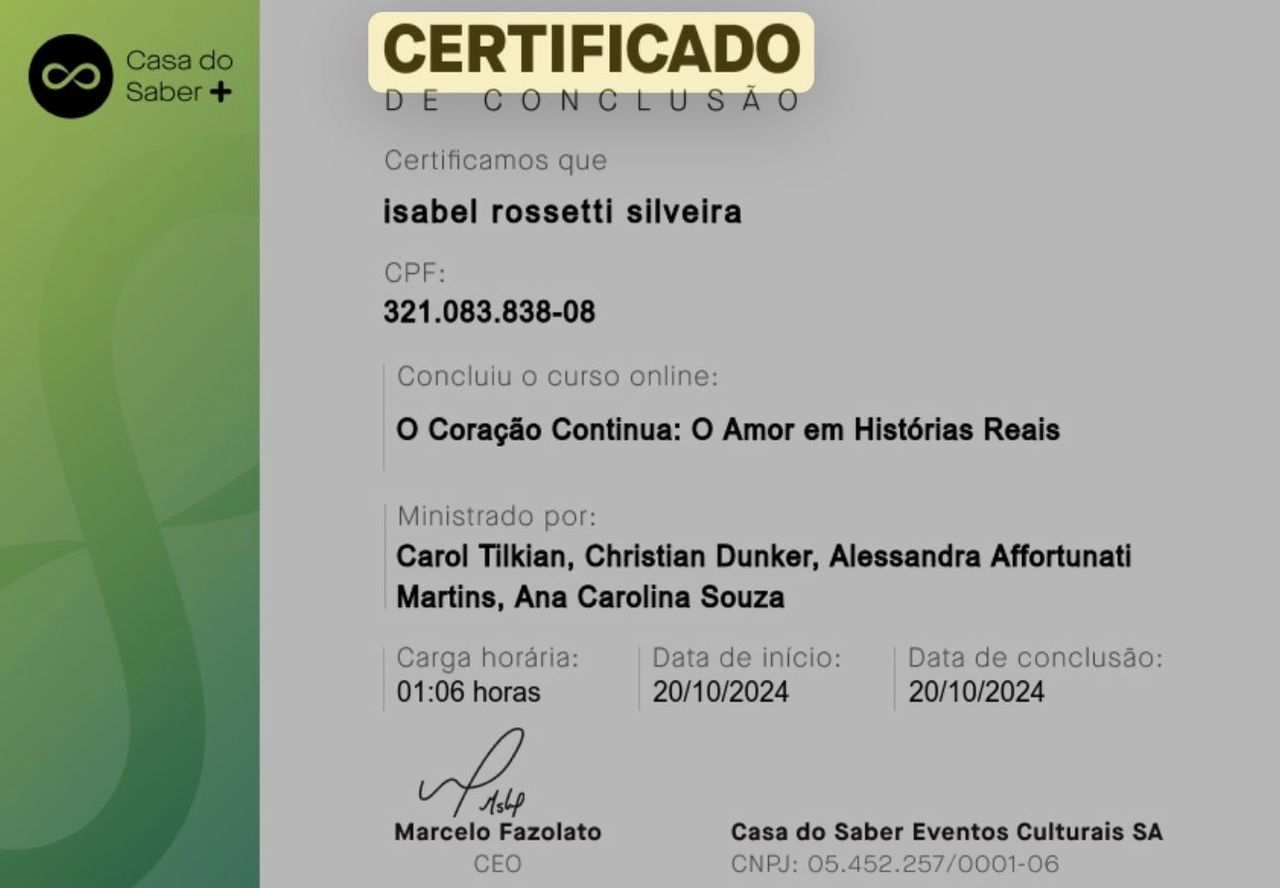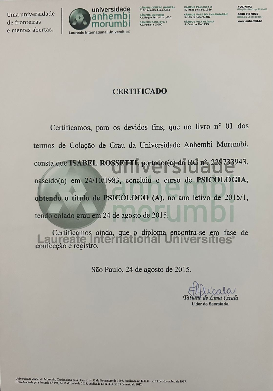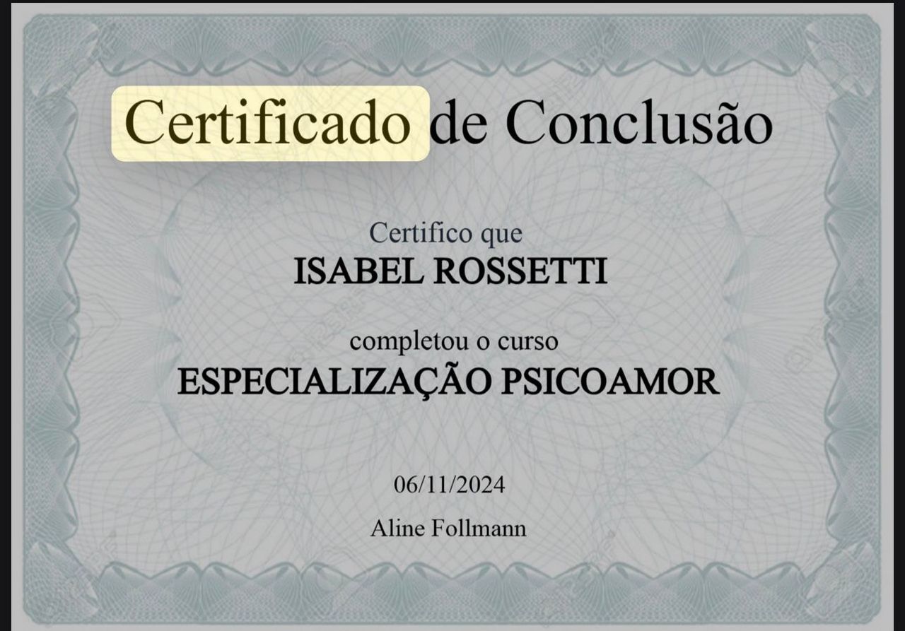 Se você está passando por um momento de angústia, ansiedade, medo ou tristeza, saiba: não precisa enfrentar isso sozinho(a). Estou aqui para te ajudar a resgatar sua força, reconstruir suas ferramentas internas, recuperar seu brilho e reencontrar o sentido da sua vida em todas as áreas, com leveza, clareza e acolhimento. Muito prazer, sou Isabel Rossetti Silveira, psicóloga clínica com mais de 10 anos de experiência e uma missão muito clara: oferecer um espaço seguro, ético e humano, onde você possa se sentir ouvido(a), respeitado(a) e verdadeiramente acolhido(a). Acredito que ninguém deveria atravessar os momentos difíceis sozinho. Por isso, construo com você uma aliança terapêutica baseada em confiança, escuta e empatia real sem julgamentos, com ciência e presença. Atendimentos online e presenciais Atendo tanto on-line (via telemedicina, conforme a Resolução CFP nº 11/2018) quanto presencialmente, no consultório localizado no Itaim Bibi – São Paulo. O agendamento é simples e seguro, com pagamento via PIX, TED, DOC ou transferência bancária. Após a confirmação, você recebe o link para a sua consulta. Formação e Experiência • Psicóloga pela Universidade Anhembi Morumbi (nota máxima no MEC) • Pós-graduada em Terapia Sistêmica de Casal e Família – UNIFESP • Pós-graduação em Inteligência Emocional e Humanização em Saúde – IPGS (coord. Pamela Magalhães) • Especialização em Psicologia do Amor – com Aline Follmann • Certificada em Contoterapia pelo método CIP – com Dra. Lisandra Zanutto (FAST – Faculdade de Administração, Saúde e Tecnologia, reconhecida pelo MEC) • Certificada em Reprogramação Emocional – Faculdade UniBF (reconhecida pelo MEC) • Participação contínua em congressos nacionais e internacionais na área de relacionamentos afetivos • Membro titular da APTF – Associação Paulista de Terapia Familiar Convites e Reconhecimento Sou frequentemente convidada por emissoras como TV Record, Rede Brasil e RedeTV! para falar sobre psicologia, relacionamentos e saúde emocional. Áreas de Atuação • Terapia individual e de casal • Dependência emocional e relacionamentos tóxicos • Ansiedade, fobias, síndrome do pânico e TAG • Depressão, distimia e tristeza profunda • Luto (inclusive por animais de estimação) • Conflitos conjugais e familiares • Solidão, estresse e traumas emocionais (TEPT) • Autoestima, autoconhecimento e inteligência emocional • Sexualidade, vaginismo e saúde mental LGBTQIA+ • Violência doméstica e transtornos por uso de álcool e drogas • Compulsões (como compras e alimentação) • Baby blues e depressão pós-parto • Cuidados paliativos Se você sente que é hora de cuidar da sua saúde emocional, estou aqui para caminhar ao seu lado com escuta, ciência e sensibilidade. Forte abraço, Isabel Rossetti Silveira Psicóloga Clínica • Especialista em relacionamentos