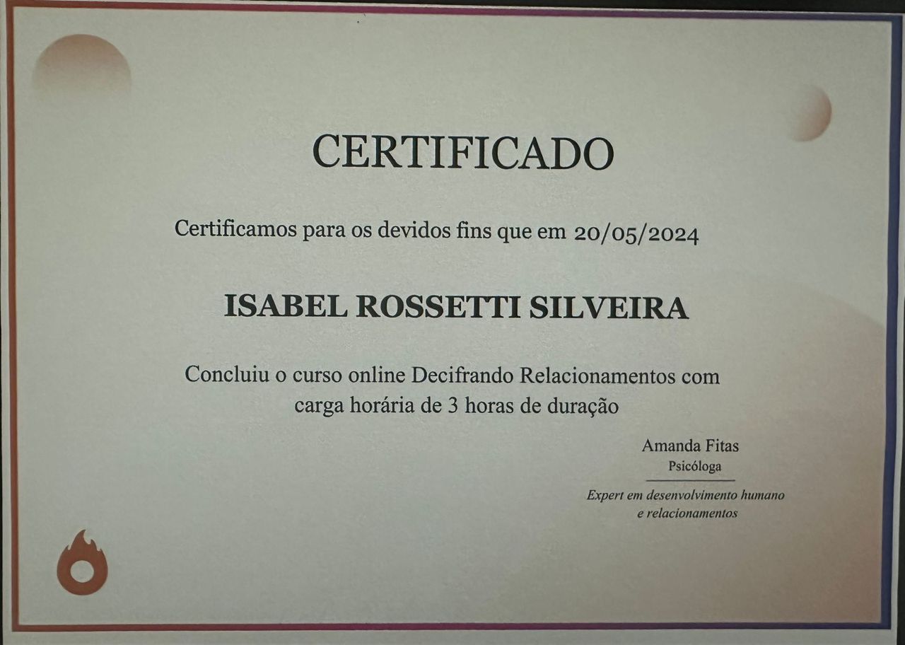 Tive uma experiência maravilhosa com a psicóloga Isabel Rossetti. Desde o primeiro atendimento, ela demonstrou escuta acolhedora, empatia e sensibilidade para compreender minhas questões com profundidade. Isabel conduz as sessões com profissionalismo, mas também com um calor humano que faz toda a diferença no processo terapêutico. Seu olhar atento e sua forma respeitosa de conduzir cada conversa me ajudaram a enxergar com mais clareza meus sentimentos e comportamentos, promovendo mudanças muito significativas na minha vida. Recomendo com todo o coração!