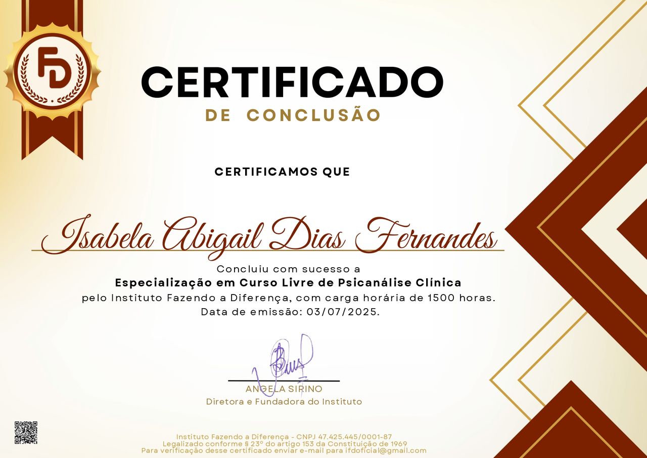 Quais são as principais especialidades de Isabela Abigail Fernandes?Isabela Abigail Fernandes é psicanalista. Te mostramos alguns dos serviços oferecidos pelo especialista graças à sua trajetória e vasta experiência: Pacote 4 consultas, Psicoterapia, Psicanálise, Psicoterapia Psicanalítica, Tratamento para compulsão alimentar, Psicoterapia adulto, Tratamento de obesidade, Teleconsulta.