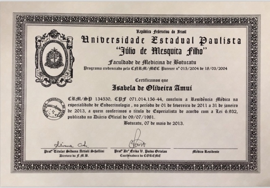 Título de Especialista em Endocrinologia pela Sociedade Brasileira de Endocrinologia e Metabologia- SP