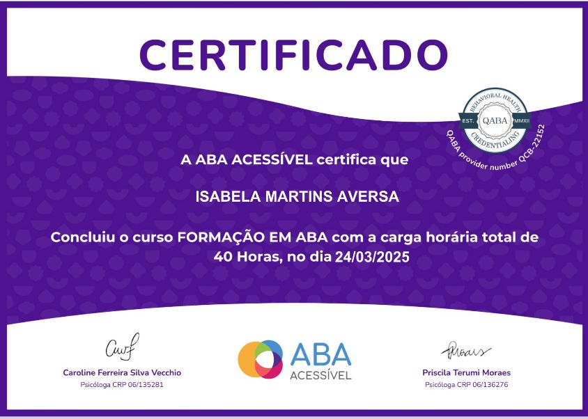 Sou Psicóloga, com área de atuação em Análise do Comportamento e Terapia Cognitivo-Comportamental, com foco no atendimento infantojuvenil. Pós-graduanda em Intervenção ABA Aplicada ao Autismo (IPOG) e em Neuropsicologia (IPOG), com experiência em terapias de intervenção no autismo e em psicoterapia infantil. Atuo no atendimento de crianças e adolescentes com demandas emocionais, comportamentais e cognitivas. Meu trabalho é baseado no afeto e no vínculo com a criança ou adolescente, no olhar individualizado e na construção de intervenções personalizadas, com produção de materiais e uso de recursos terapêuticos adaptados às necessidades de cada criança.
