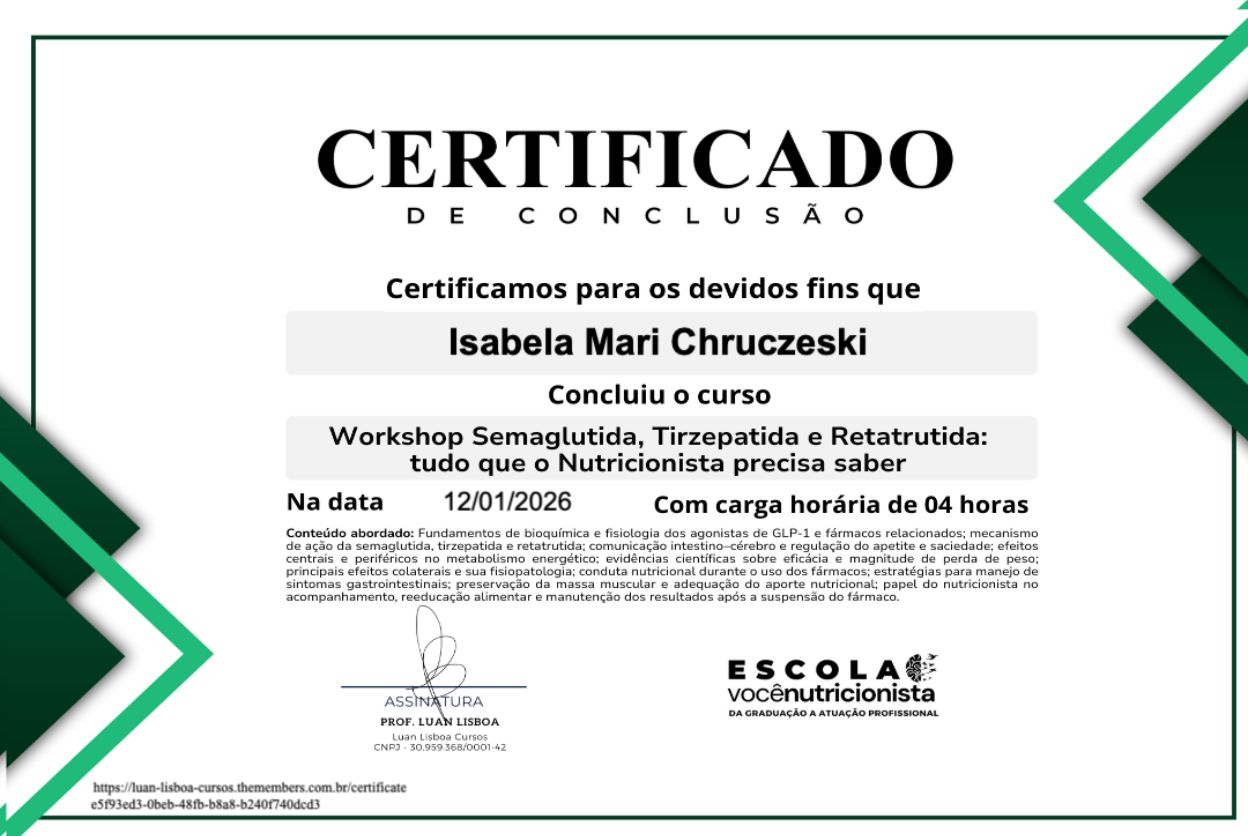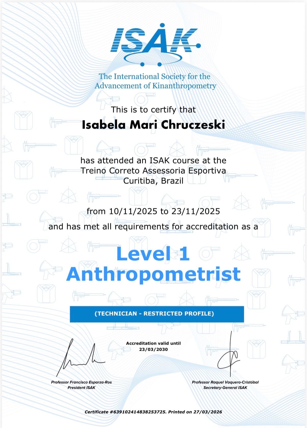 Desde que comecei as consultas, percebi detalhes que fizeram diferença na minha rotina, como disposição, mais energia para os treinos e dia a dia, o meu intestino ficou mais regulado e estou começando a beber mais água também. Continuarei com ela e recomendo.• Isabela Chruczeski Nutricionista • Consulta de nutrição •