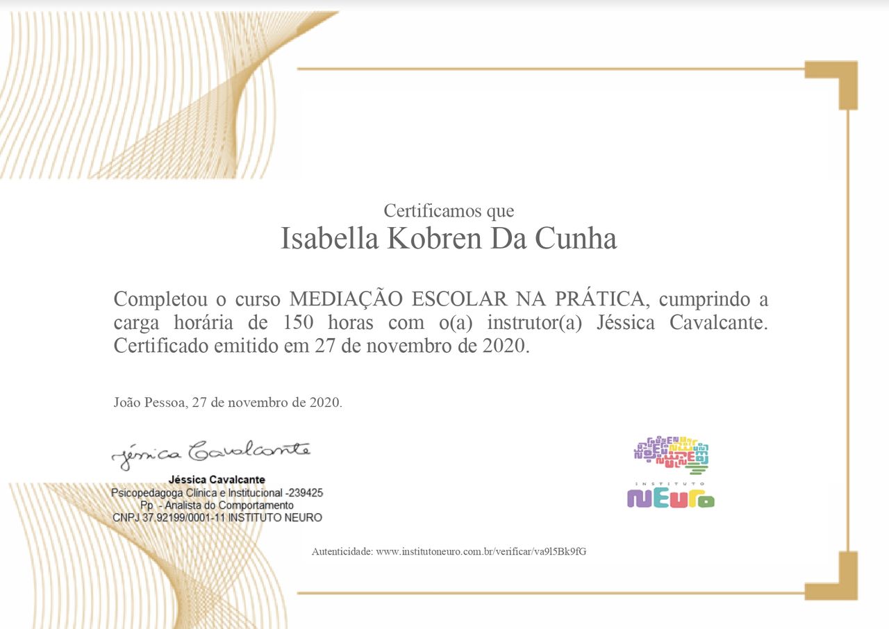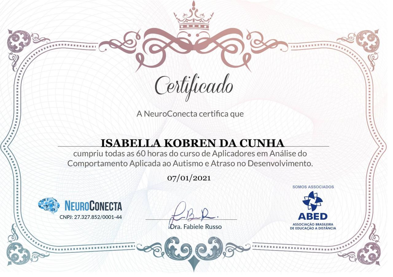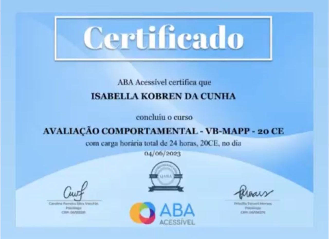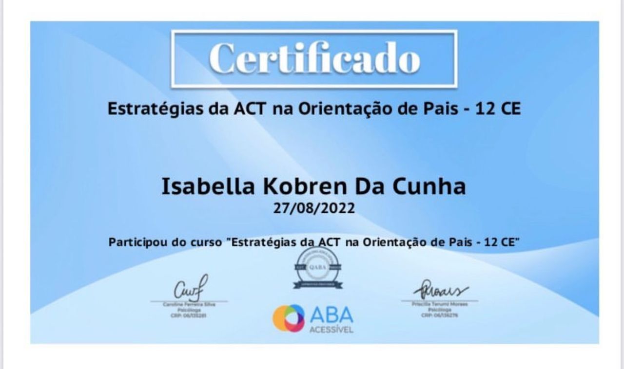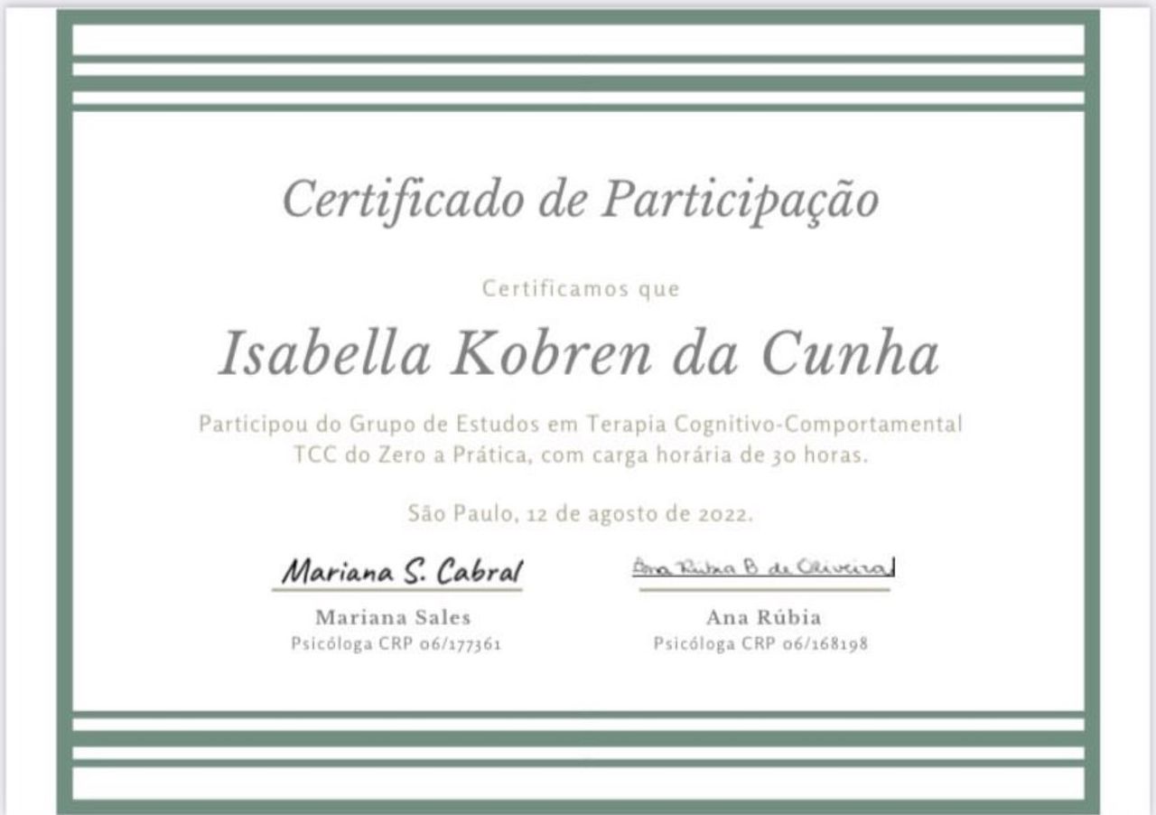 Quais são as principais especialidades de Isabella Kobren da Cunha?Isabella Kobren da Cunha é psicóloga. Te mostramos alguns dos serviços oferecidos pelo especialista graças à sua trajetória e vasta experiência: Psicoterapia, Terapia Cognitivo Comportamental, Orientação aos pais, Psicoterapia Criança, Consulta psicológica do adolescente, Consulta psicológica da criança, Acompanhamento de transtorno do espectro autista (TEA), Treinamento de habilidades sociais, Análise do Comportamento Aplicada (ABA), Consulta Psicologia.