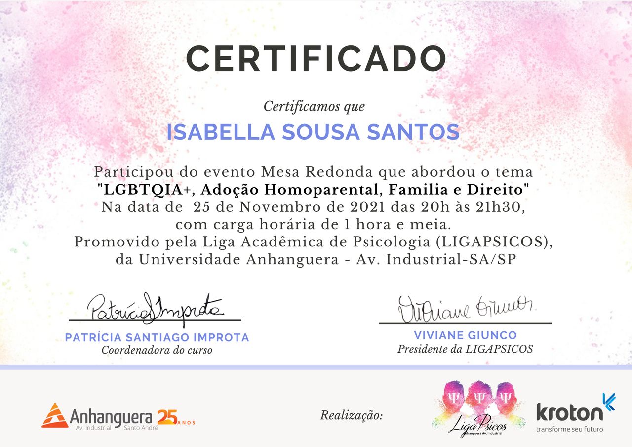 Quando poderia me consultar com Isabella Sousa Santos?Isabella Sousa Santos costuma ter horários disponíveis dentro da mesma semana ou para a semana seguinte. Verifique o calendário: você verá o primeiro horário disponível, atualizado em tempo real. Caso o horário sugerido não funcione para você, verifique outras datas. Agendar uma consulta é sempre imediato e gratuito.