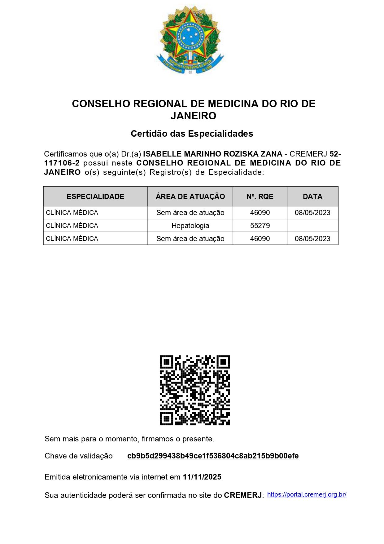 Quais são as principais especialidades de Isabelle Roziska?Isabelle Roziska é hepatologista, especialista em clínica médica. Te mostramos alguns dos serviços oferecidos pelo especialista graças à sua trajetória e vasta experiência: Consulta Hepatologia, Consulta clínica médica, Consulta particular, Consulta de retorno, Tratamento diabetes mellitus, obesidade e síndrome metabólica, Tratamento para cirrose hepática, Consulta de rotina, Consulta médica, Teleconsulta.