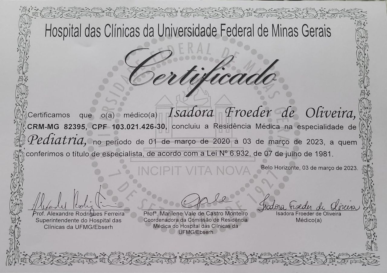 Quais são as principais especialidades de Isadora Froeder de Oliveira?Isadora Froeder de Oliveira é pediatra. Te mostramos alguns dos serviços oferecidos pelo especialista graças à sua trajetória e vasta experiência: Primeira consulta Pediatria, Preparação para o puerpério, Consulta particular de pediatria, Saúde Escolar, Acompanhamento de consulta pediatria geral, Nutrição na amamentação, Retorno de consultas Pediatria, Consulta pediatria, Tratamento de diarréia, Investigação de causas de ictericia.