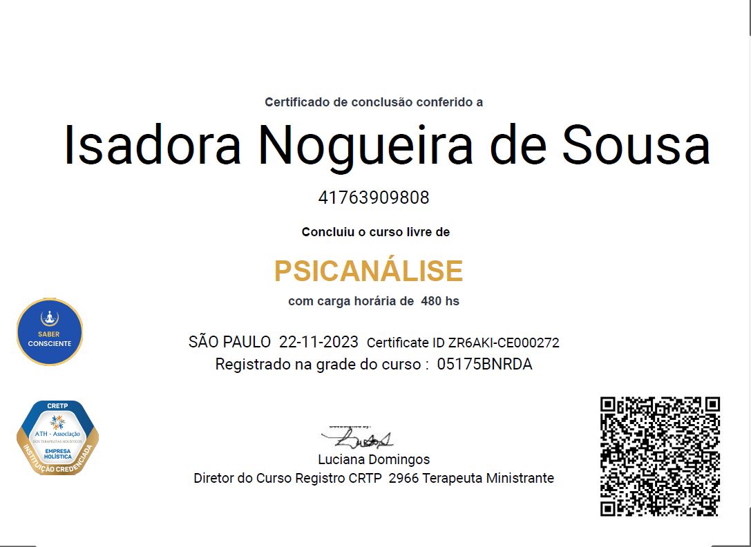 Quais são as principais especialidades de Isadora Nogueira?Isadora Nogueira é psicanalista. Te mostramos alguns dos serviços oferecidos pelo especialista graças à sua trajetória e vasta experiência: Consulta em psicanálise online, Orientação profissional, Autodesenvolvimento pessoal e profissional, Terapia para insatisfação profissional, Insatisfação profissional, Psicanalise para relacionamentos, Consulta psicanalise para mulher, Tratamento para dificuldade de relacionamento de casal, familiar e profissional, Primeira consulta psicanálise.