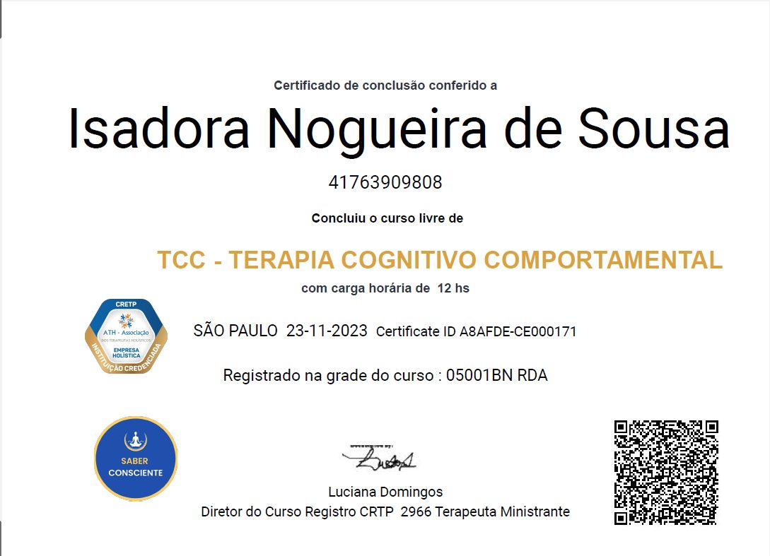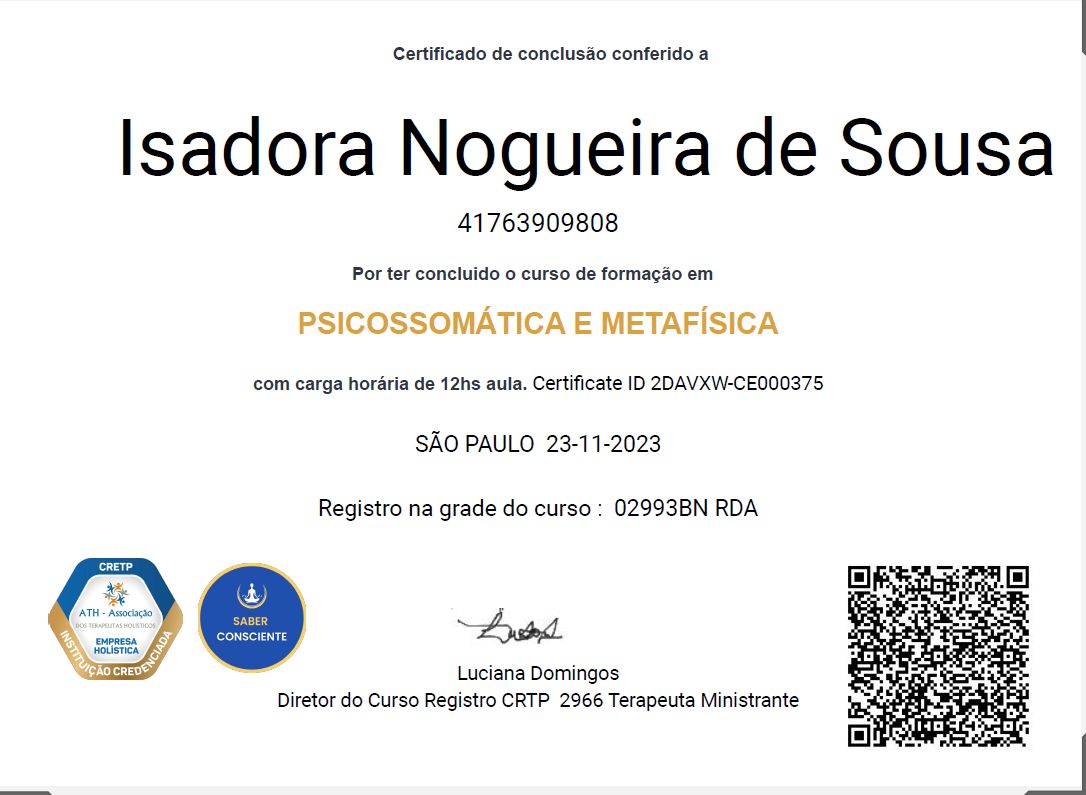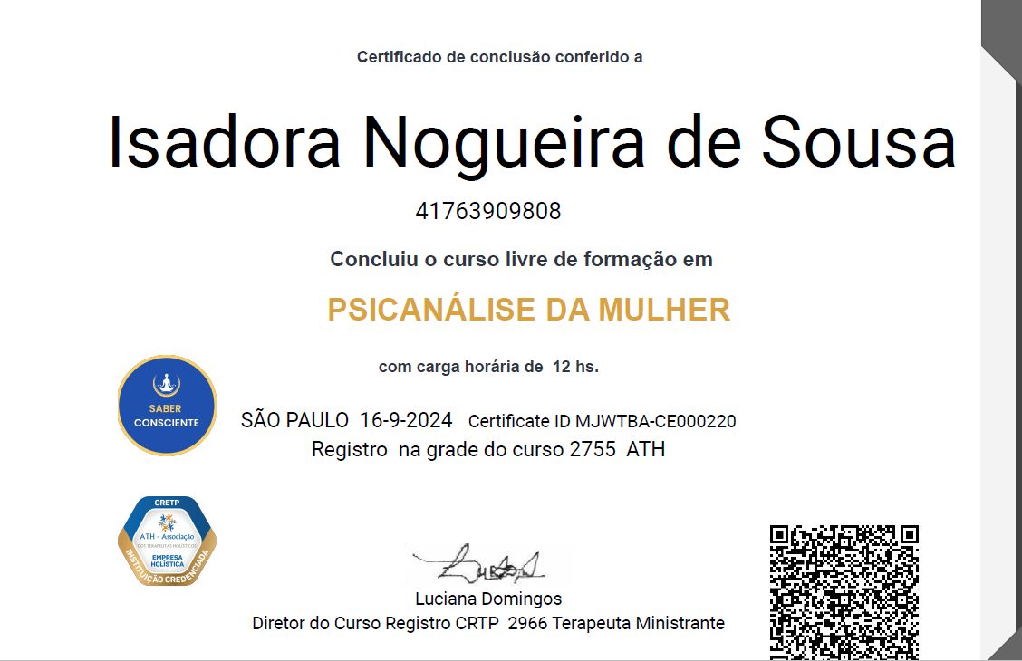 Olá! Sou Isadora Nogueira, Psicanalista e Orientadora de Carreira, com experiência em ajudar pessoas a redefinirem sua trajetória profissional, compreenderem suas emoções e tomarem decisões com mais clareza e propósito.