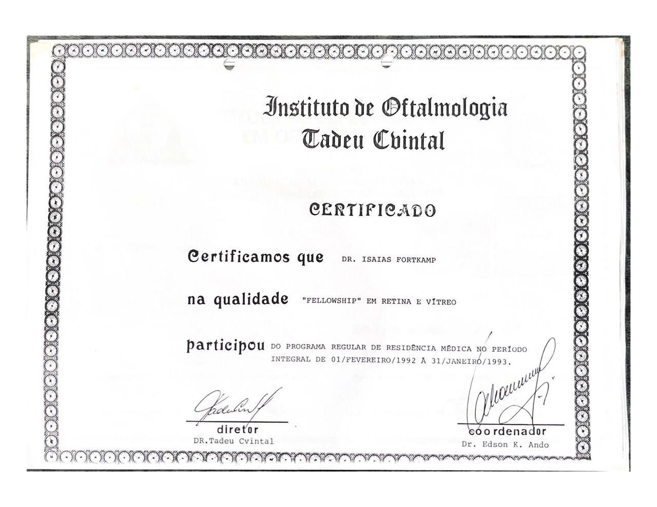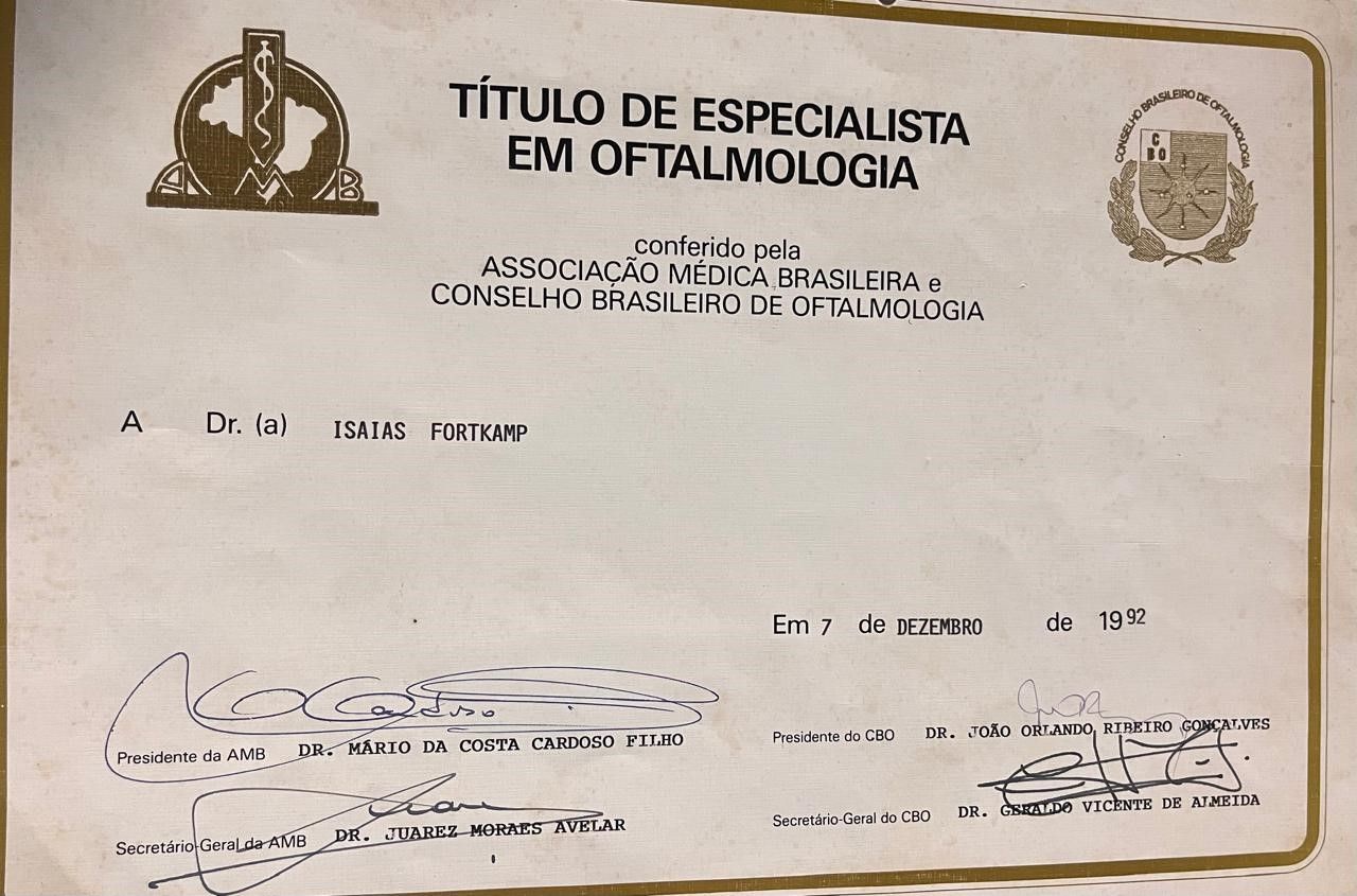 Dr. Isaias Fortkamp (CRM 4838 – RQE 1509) é um oftalmologista renomado com mais de 30 anos de experiência, formado pela Universidade Federal de Santa Catarina (UFSC). Ele completou sua Residência Médica e Fellowship em Retina e Vítreo no Instituto de Oftalmologia Tadeu Cvintal, em São Paulo, refinando suas habilidades em sua especialidade.