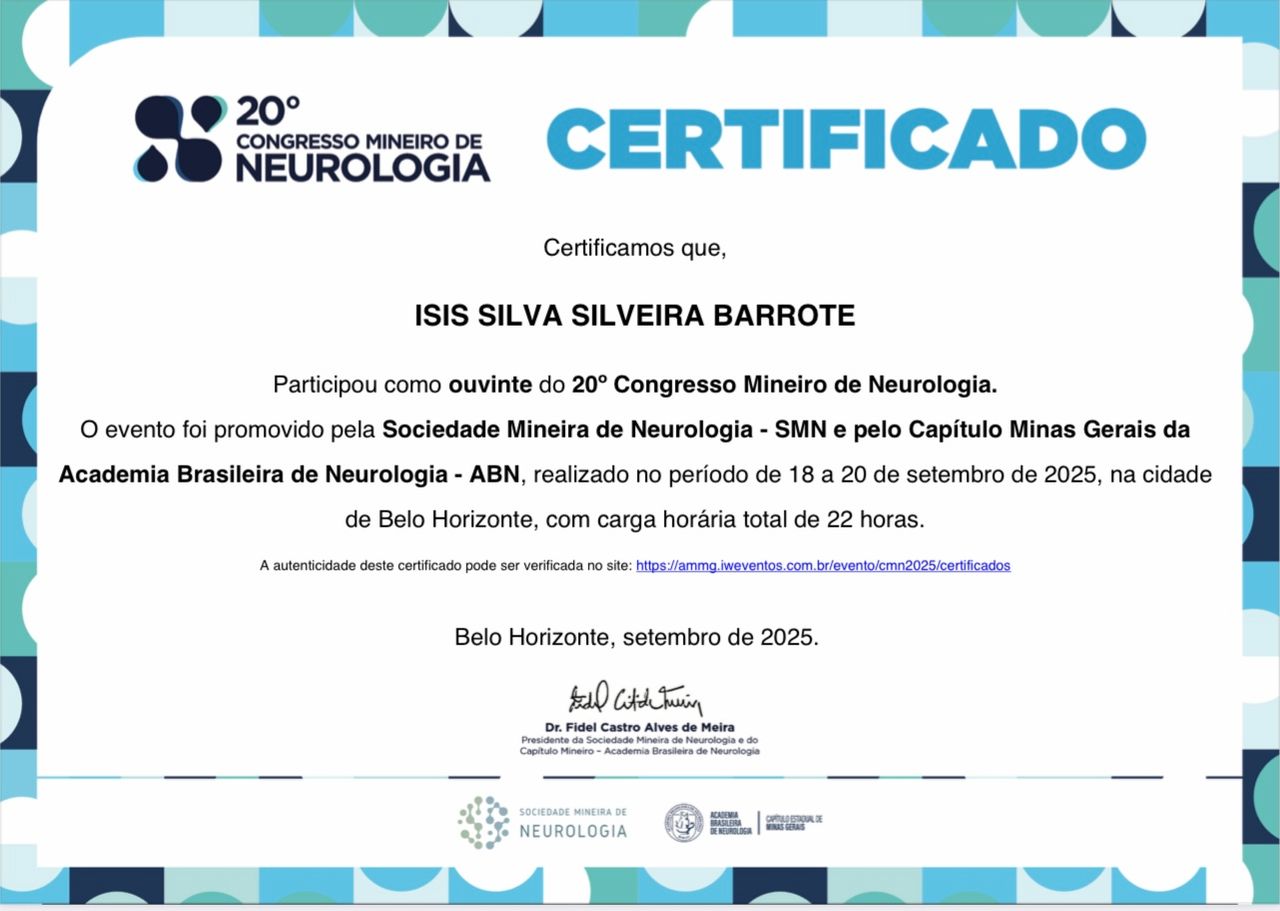 Médica formada pela Pontifícia Universidade Católica de Minas Gerais (PUC Minas - campus Betim). Neurologista pelo Hospital Socor. CRM MG 82526 | RQE 62711. Após me formar em Medicina, trabalhei como Generalista por 01 ano antes de ingressar na Residência Médica. Tenho experiência como Médica Generalista pela Prefeitura de Belo Horizonte: atuei como Clínica de Apoio no Centro de Saúde Carlos Chagas entre 2020 e 2021. Trabalhei por 02 meses na Clínica Mais Ocupacional, em BH, com Medicina do Trabalho. Durante a Residência em Neurologia, exerci ainda o trabalho de Plantonista de Clínica na Unidade de Internação do Hospital São Francisco de Assis - Unidade Santa Lúcia. Também trabalhei como Neurologista nos Hospitais Madre Teresa e Belo Horizonte. Tais experiências foram grandiosas, e contribuíram muito para que eu me tornasse uma Médica mais completa, detalhista e humana. Atualmente realizo atendimentos presenciais em Belo Horizonte/MG e online. Trabalho nos Hospitais Mater Dei Nova Lima, Socor e Risoleta Neves. Sou preceptora da residência de Neurologia do Hospital Socor e professora da Semiologia de Neurologia do curso de Medicina da PUC Minas - campus Contagem. Prezo pela prática da Medicina humanizada e baseada em evidências. O respeito pelos meus pacientes e seus acompanhantes está sempre em primeiro lugar! Será um prazer atendê-lo(a)!