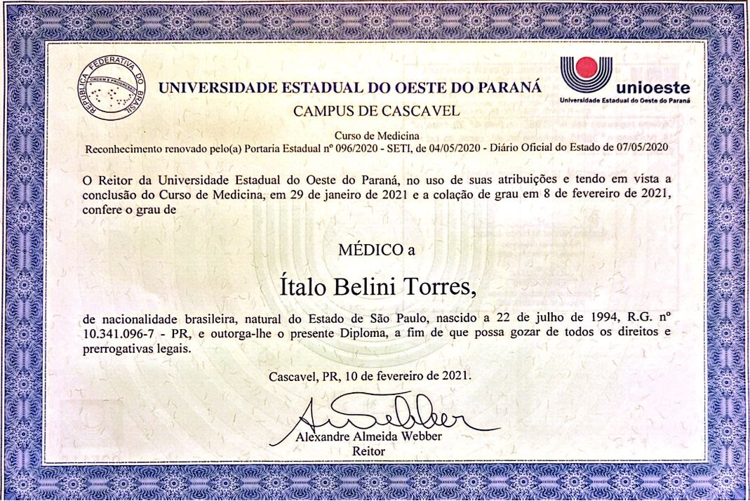 Sou formado em Medicina pela Universidade Estadual do Oeste do Paraná, em Cascavel, onde também concluí minha residência médica em Medicina de Família e Comunidade.