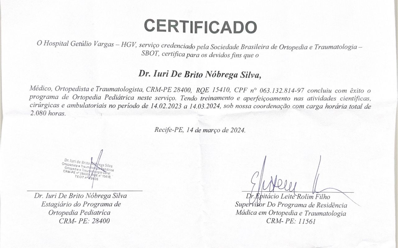 "Sou o Dr. Iuri de Brito, ortopedista pediátrico com paixão por transformar vidas. Minha pós-graduação em Reconstrução e Alongamento Ósseo me permite tratar deformidades raras e complexas. Meu foco está na cirurgia do quadril infantil, na correção de pés e na aplicação de técnicas para guiar o crescimento, sempre buscando o melhor resultado e qualidade de vida para meus pequenos pacientes."
