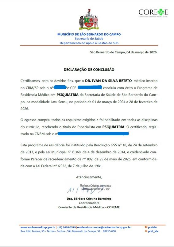 Sou médico psiquiatra formado pela Universidade Júlio de Mesquita Filho (UNESP-SP) e Secretaria Municipal de Saúde de São Bernardo do Campo, pós-graduado Psicofarmacologia Avançada e Farmacogenética. Tenho 15 anos de experiência em saúde mental, com formação prévia em psicologia pela Universidade Presbiteriana Mackenzie. Atualmente, atuo na Residência em Psiquiatria da Infância e Adolescência do HC-FMRP-USP.