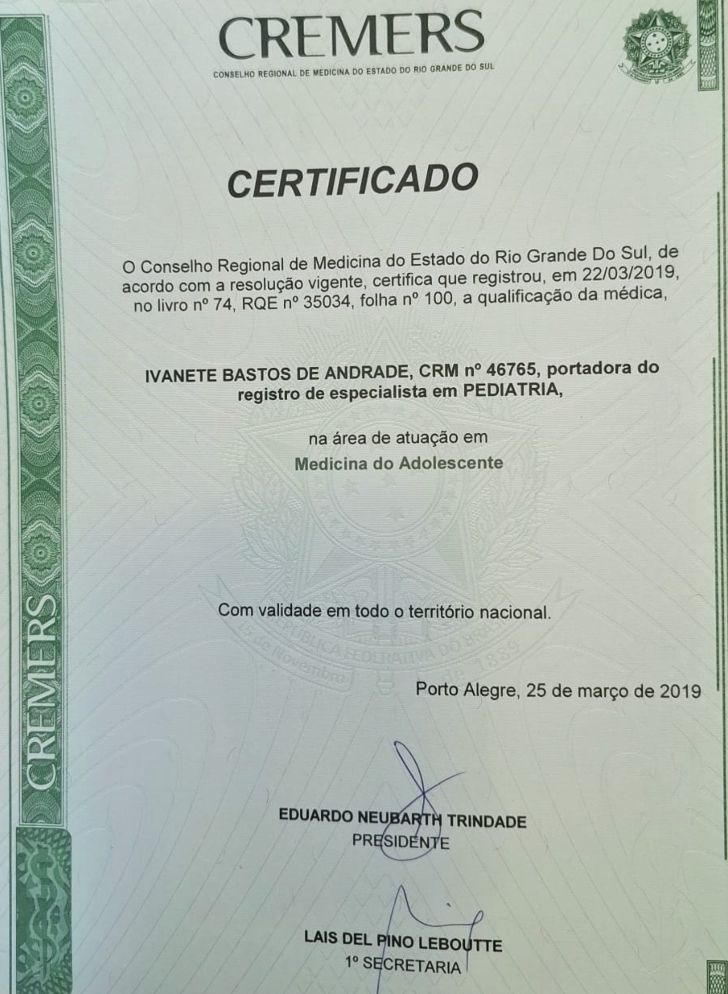 Quais são as principais especialidades de Ivanete Bastos de Andrade?Ivanete Bastos de Andrade é pediatra, especialista em medicina do adolescente, médica de família. Te mostramos alguns dos serviços oferecidos pelo especialista graças à sua trajetória e vasta experiência: Teleconsulta, Primeira consulta Medicina de Família e Comunidade.