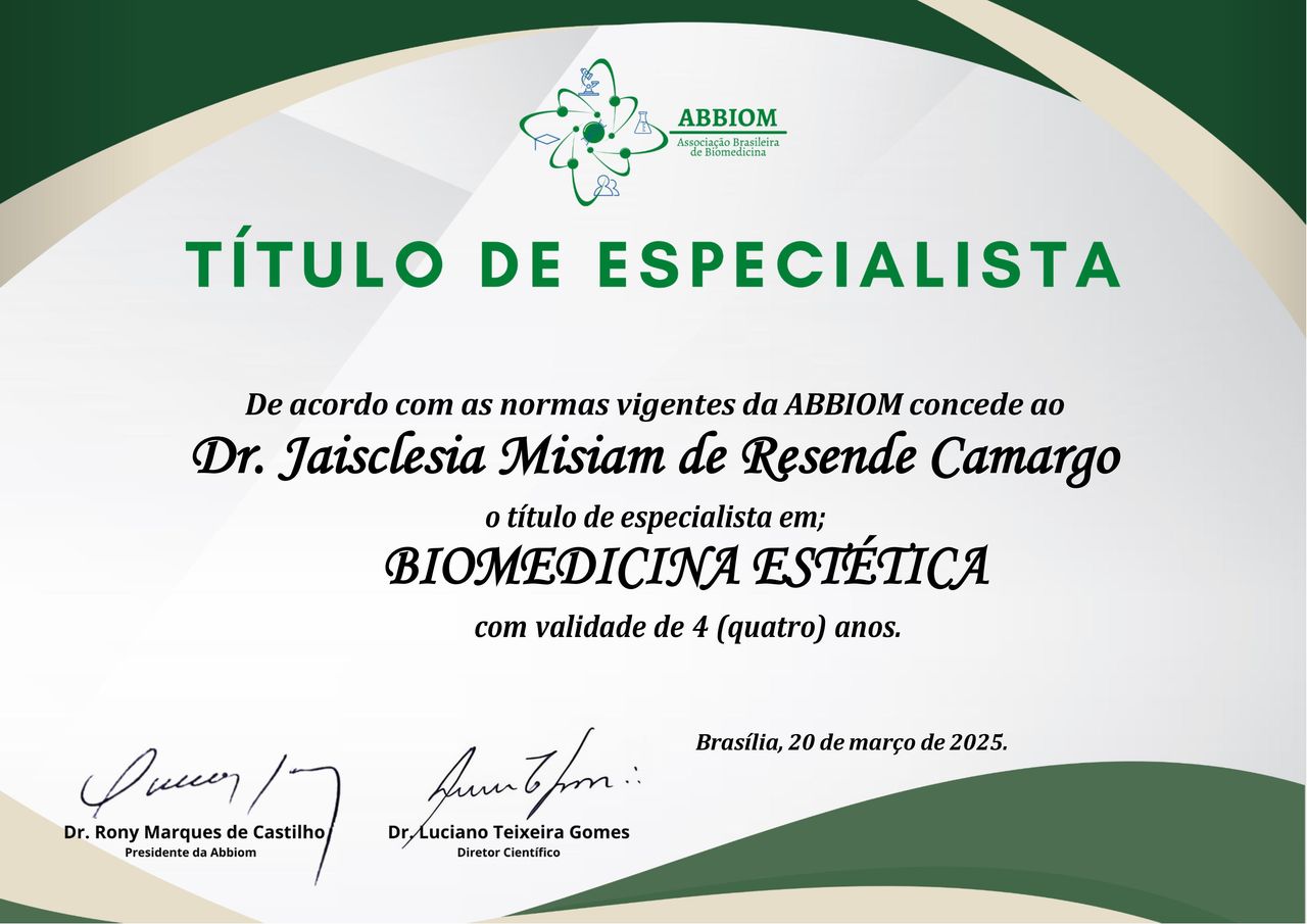 Quais são as principais especialidades de Jaisclesia Misiam?Jaisclesia Misiam é especialista em biomedicina. Te mostramos alguns dos serviços oferecidos pelo especialista graças à sua trajetória e vasta experiência: Tratamento de Estrias, Preenchimento labial, Peeling químico, Tratamentos de olheiras, Tratamento para melasma, Preenchimento facial, Consulta geral, Laserterapia.