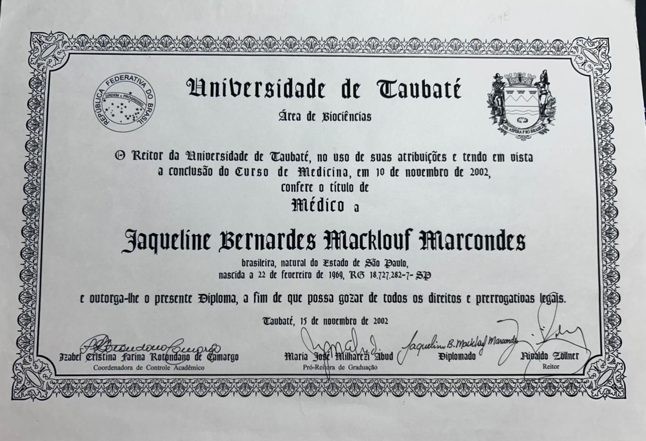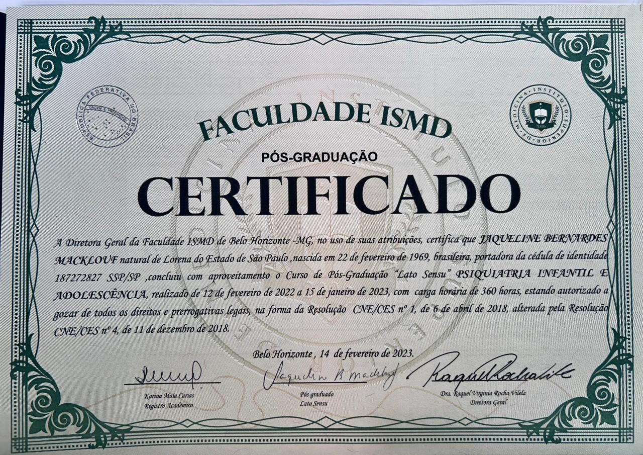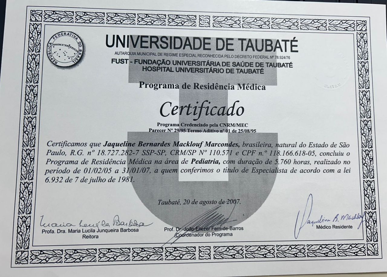 Sou Jaqueline Macklouf formada na Unitau em 2002 e após realizei residência em Pediatria na mesma instituição. Realizei Pós graduação em Psiquiatria da Infância e Adolescência.
