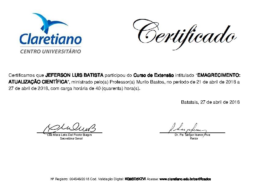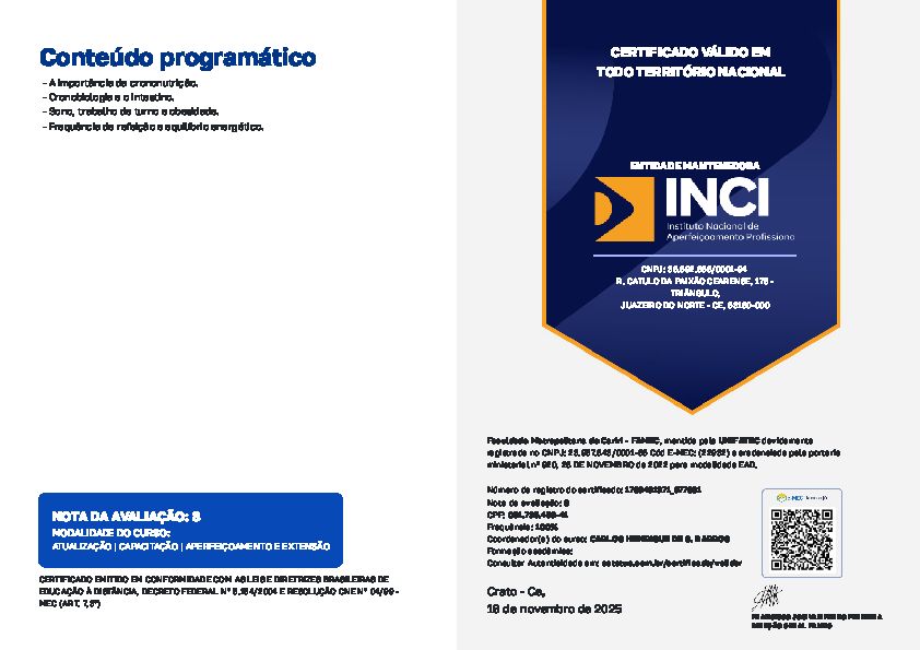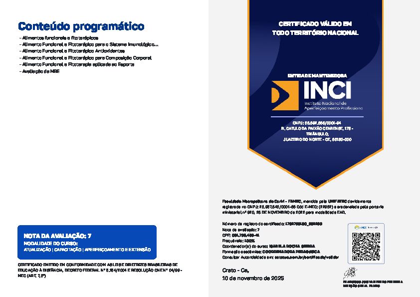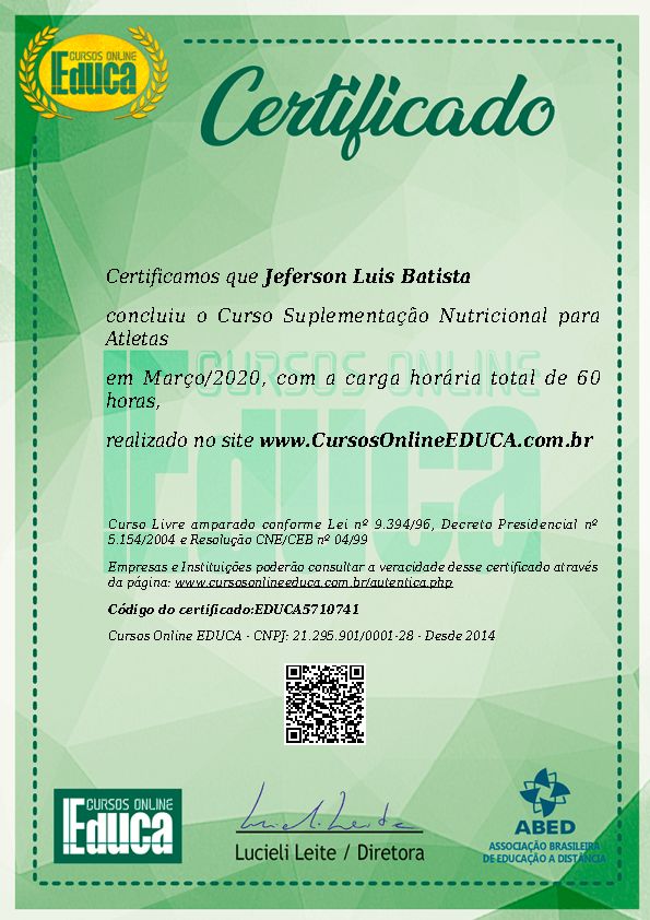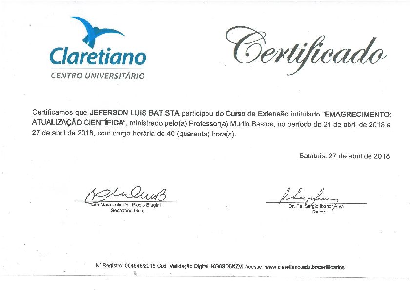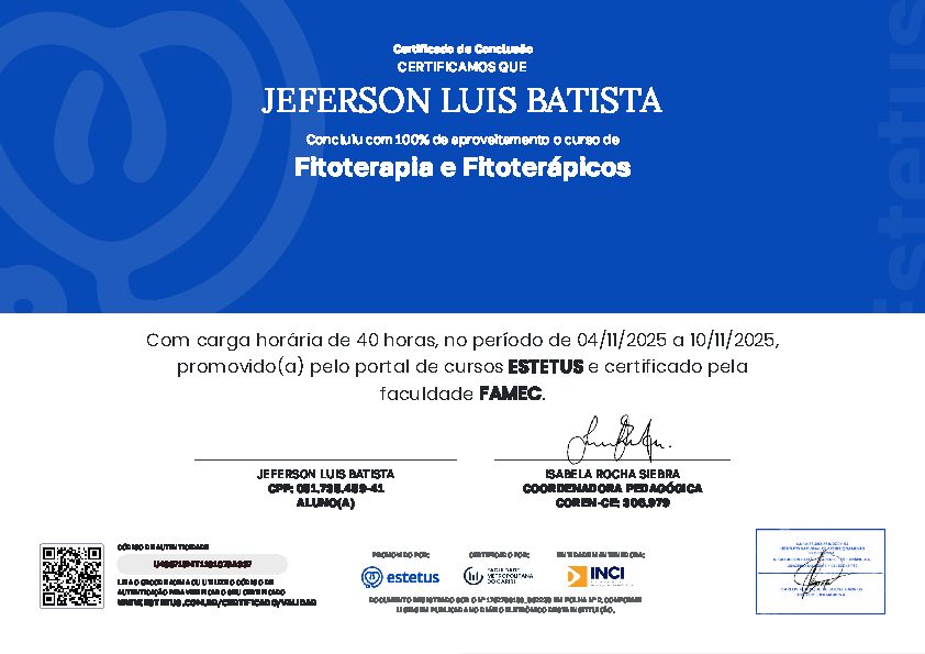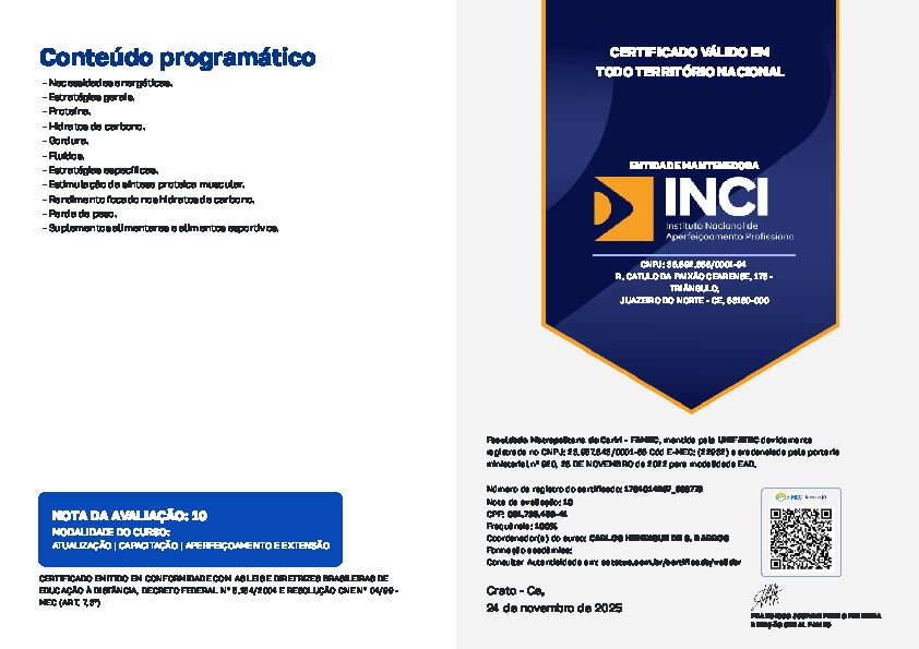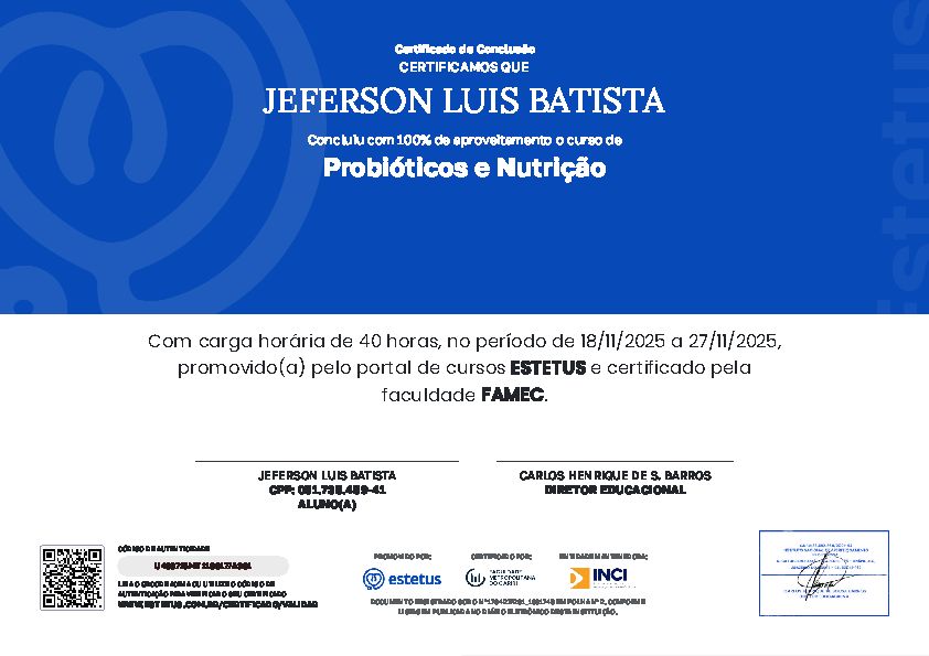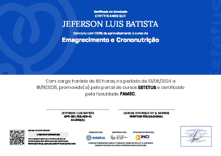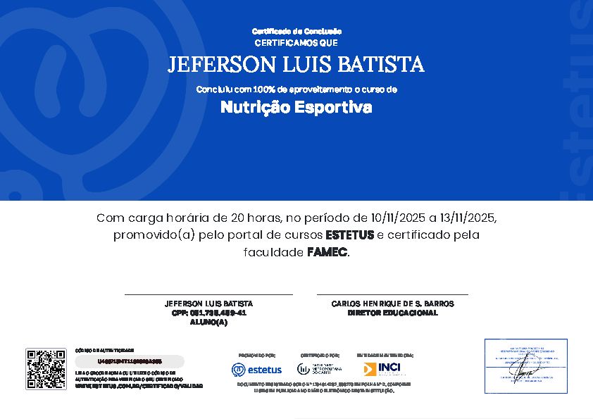 Ao longo da minha carreira, tenho me dedicado a aprimorar meu conhecimento por meio de formações complementares, incluindo temas como Fisiologia do Emagrecimento, Suplementação Nutricional para Atletas e Avaliação Física.