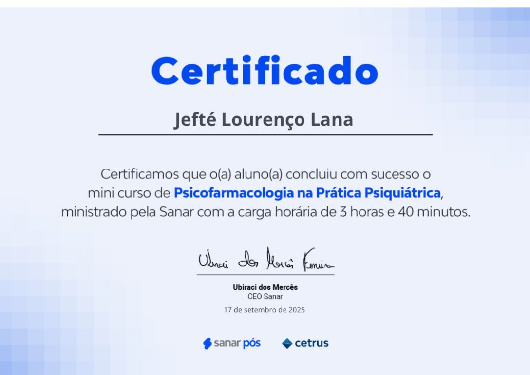 Quais são as principais especialidades de Jefté Lourenço Lana ?Jefté Lourenço Lana é psiquiatra, médico clínico geral, generalista. Te mostramos alguns dos serviços oferecidos pelo especialista graças à sua trajetória e vasta experiência: Primeira consulta clínica médica, Tratamento da depressão, Tratamento da ansiedade, Teleconsulta.