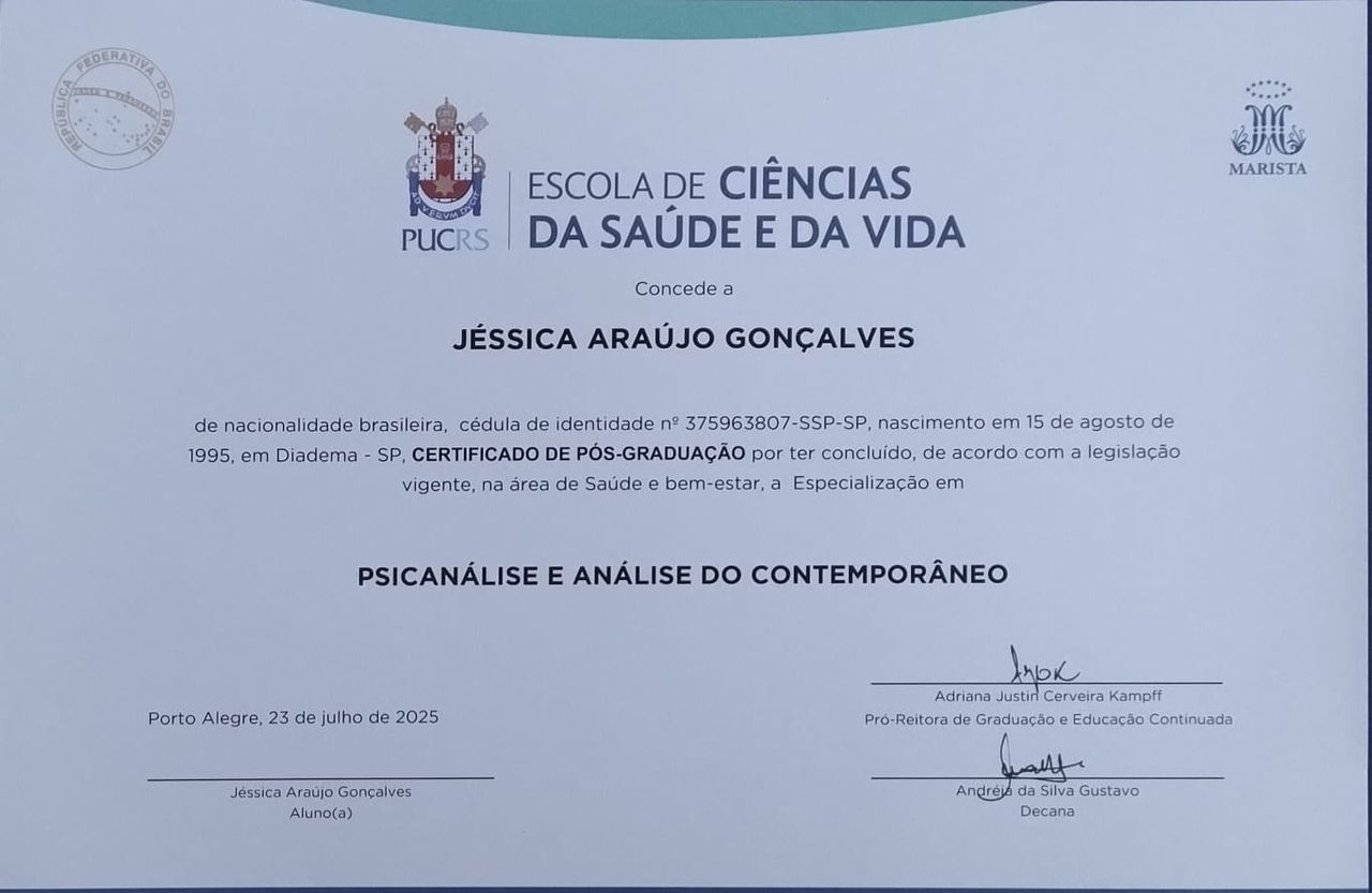 Sou psicóloga (CRP 06/181568), formada pela Universidade São Judas Tadeu e pós-graduada em Psicanálise e Análise do Contemporâneo pela PUC-RS. Atuo na clínica com adolescentes e adultos, oferecendo análise pessoal e psicoterapia breve com base na abordagem psicanalítica.