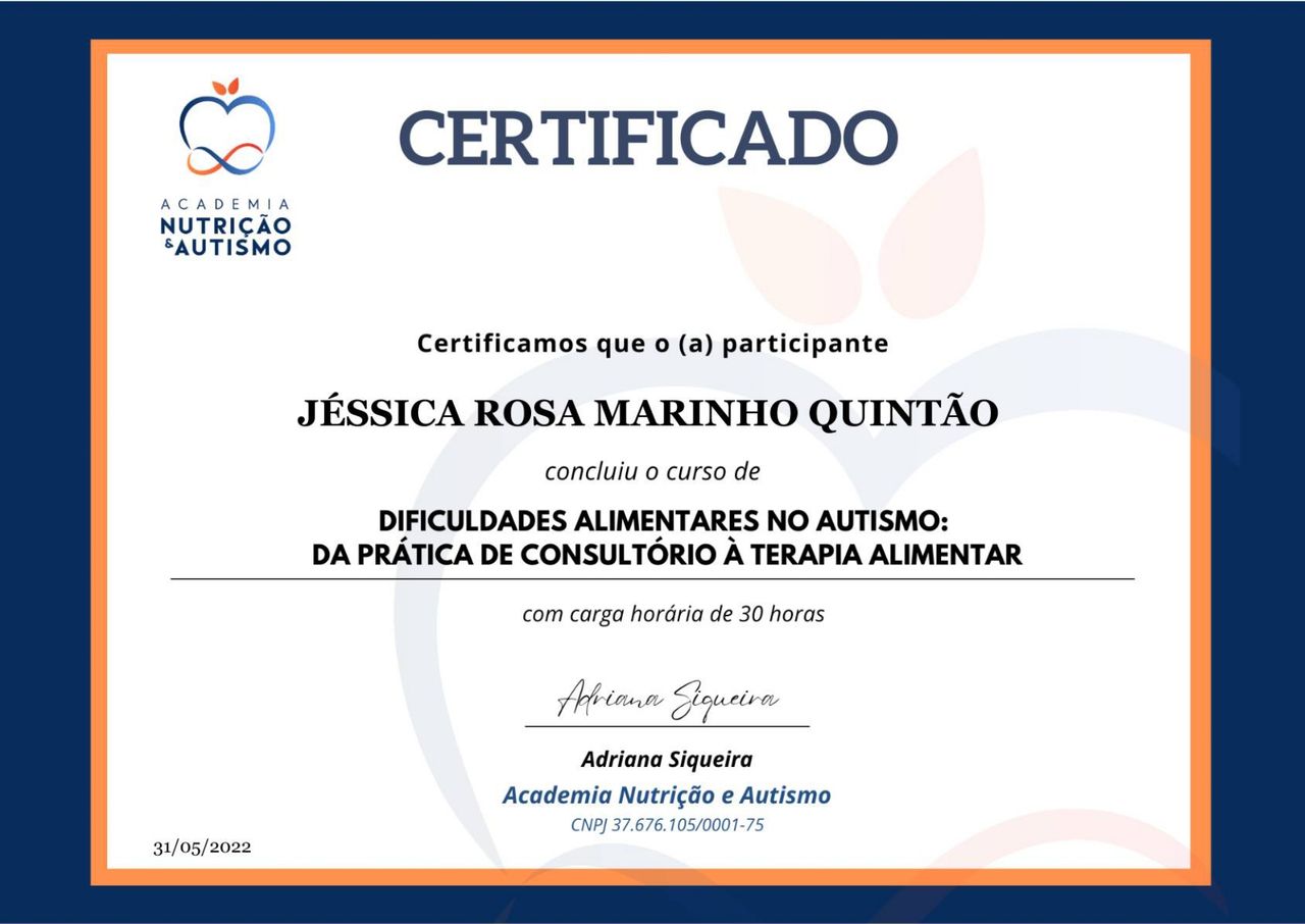 Nutricionista e Terapeuta Alimentar. Nutricionista, graduada pela Universidade do Estado do Rio de Janeiro (UERJ). Possuo Especialização em Terapia Nutricional em Pediatria. Experiência no atendimento nutricional de crianças típicas e neurodivergentes (Transtorno do Espectro Autista e TDAH) e gestantes. Atendimento de Distúrbios Alimentares, principalmente Seletividade Alimentar.
