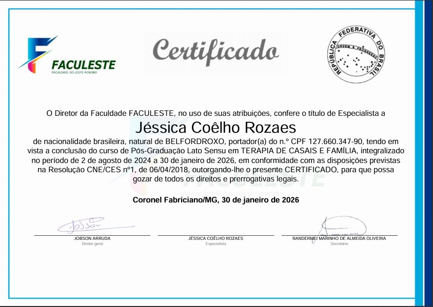 Fomos fazer terapia de casal com a Jéssica e fica até difícil avaliar porque ela é muito além do que esperávamos. Orientações claras, linguagem de fácil entendimento, faz você se sentir à vontade. Ela é perfeita como profissional! Vamos continuar com ela. Super indico!