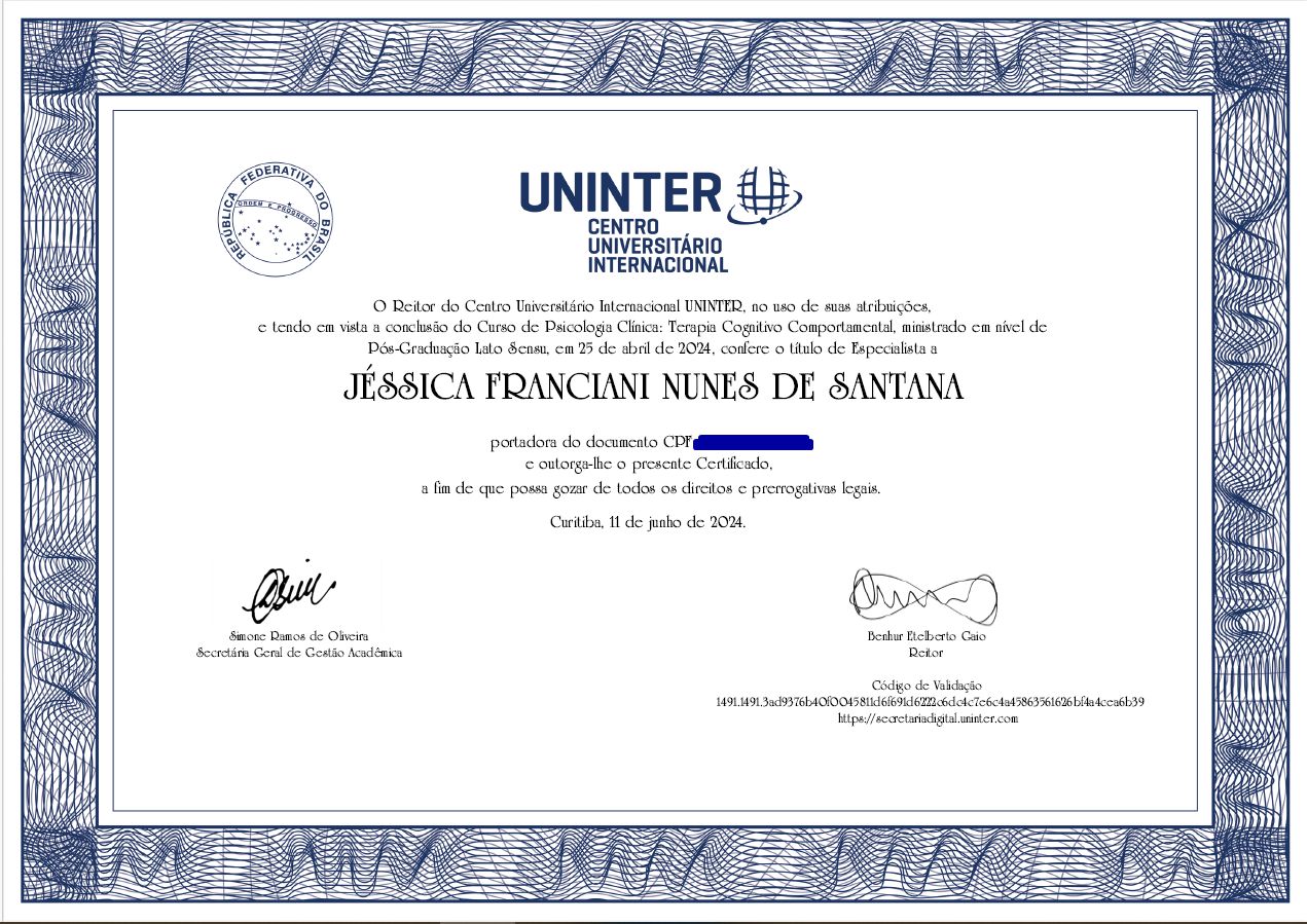 Jéssica tem sido uma ótima profissional trazendo apontamentos e reflexões que eu jamais havia percebido. Estou muito feliz com o tratamento e já vejo resultados.