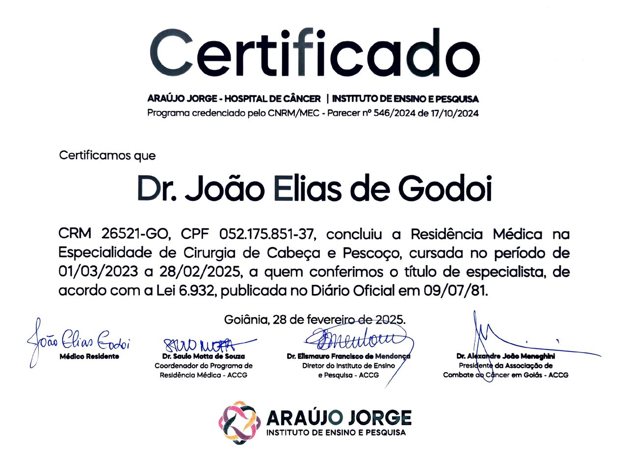João Elias de Godoi é cirurgião de cabeça e pescoço. Te mostramos alguns dos serviços oferecidos pelo especialista graças à sua trajetória e vasta experiência: Laringoscopia Indireta, Consulta de acompanhamento em cirurgia de cabeça e pescoço, Primeira consulta Cirurgia de Cabeça e Pescoço, Consulta cirurgia de cabeça e pescoço.