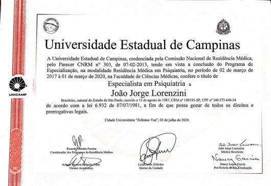 - Residência Médica em Psiquiatria pela UNICAMP (Universidade Estadual de Campinas)