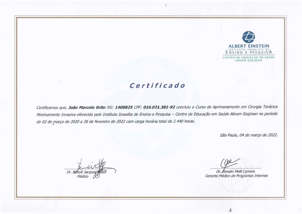 Número de registro: CRM SP 204545 - RQE Cirurgia Torácica 98385 - RQE Endoscopia Respiratória 247716 - RQE Cirurgia Geral 78175