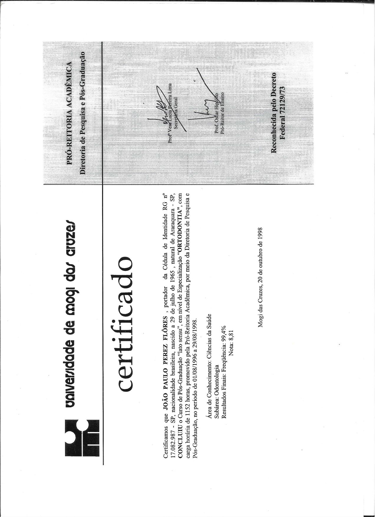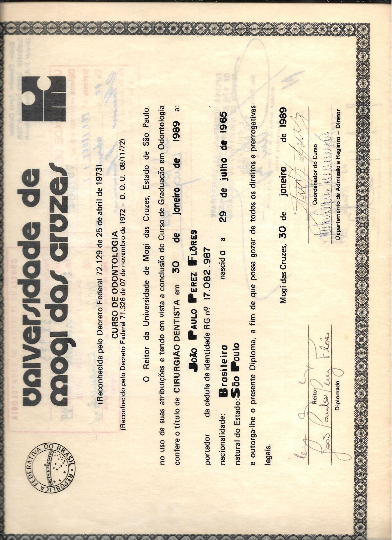 Formado na Universidade de Odontologia Mogi Das Cruzes em 1989