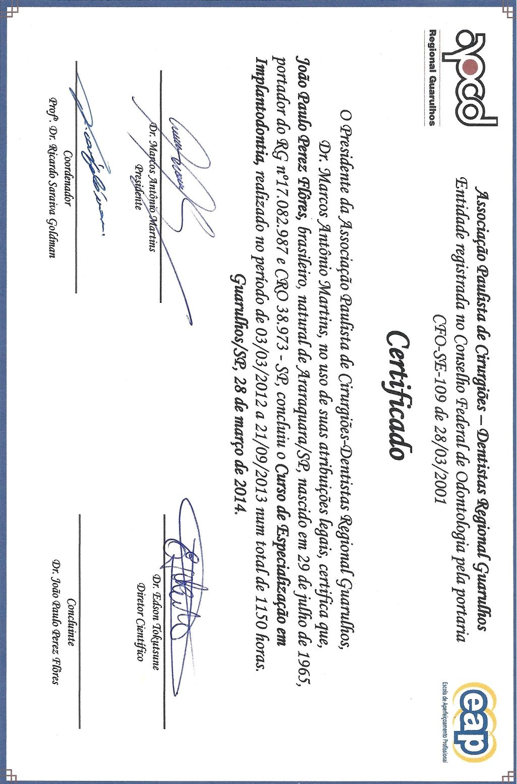 Especialista em implantodontia pela Escola de aperfeiçoamento APCD/Guarulhos