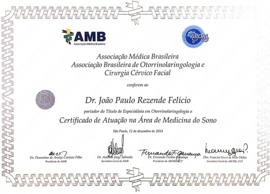 Título de Especialista em Medicina do Sono pela Associação Brasileira de Otorrinolaringologia e Cirurgia Cérvico Facial.