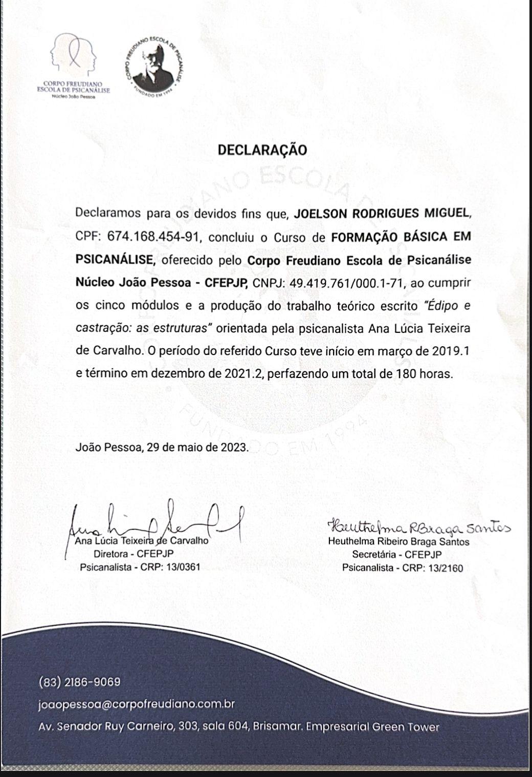 Joelson contribuiu de forma significativa durante o meu processo, foi determinante suas intervenções.• Consultório para consultas online • Análise Online •