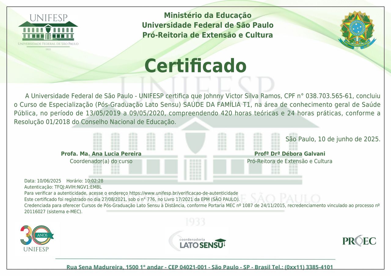 Sou formado em Medicina pela PUC-SP (2015), possuo pós-graduações em Saúde da Família (UNIFESP - 2021) e Medicina do Exercício e do Esporte (CEFIT - 2021).