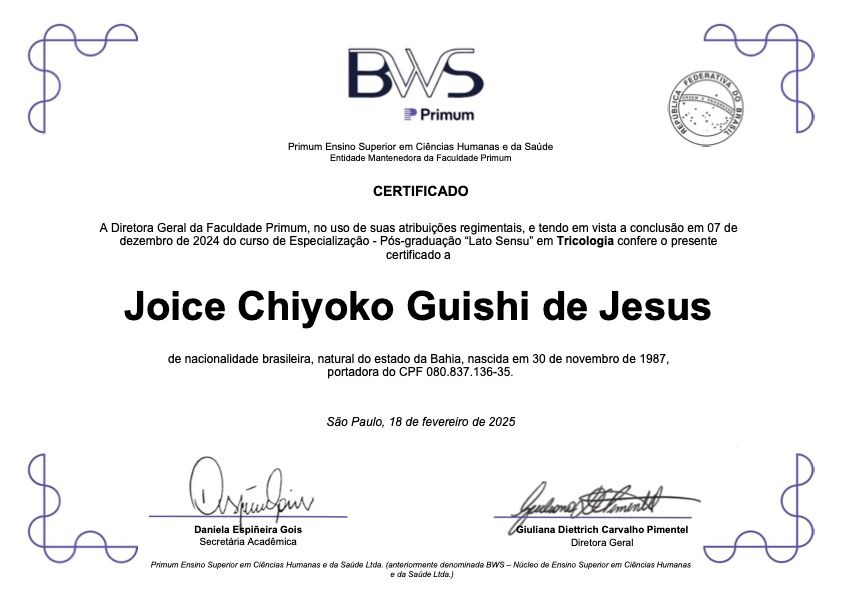 Estou em constante atualização e uno ciência, tecnologia e técnicas modernas e seguras a um atendimento verdadeiramente acolhedor. Acredito que restaurar cabelos também é restaurar autoestima, identidade e confiança.