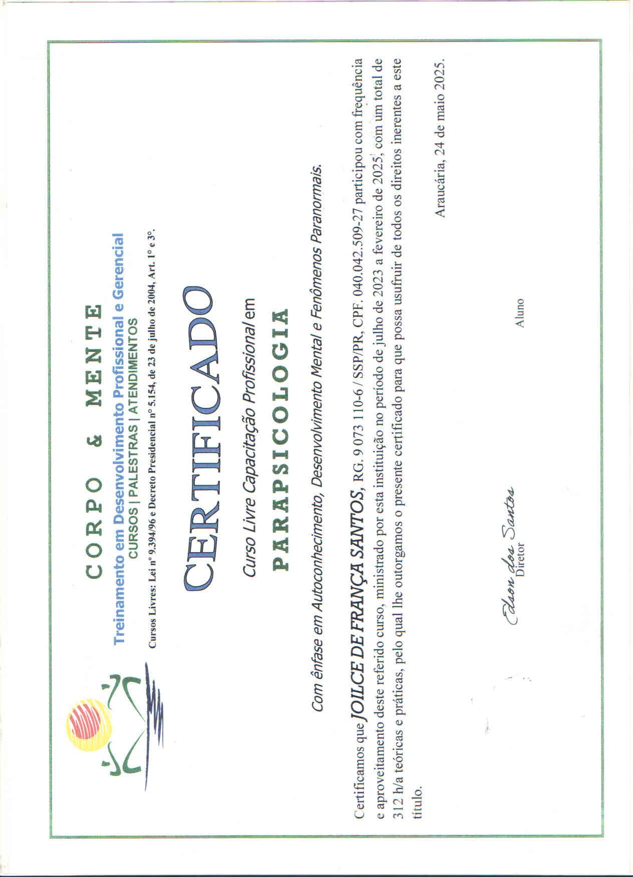 Terapeuta Complementar e Parapsicóloga.Formada pela Escola Corpo e Mente.Espaço seguro para cuidado emocional.