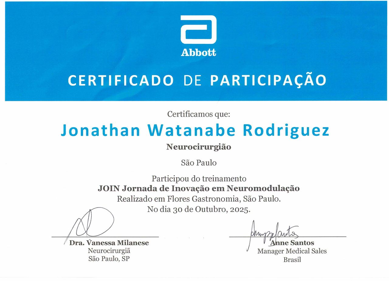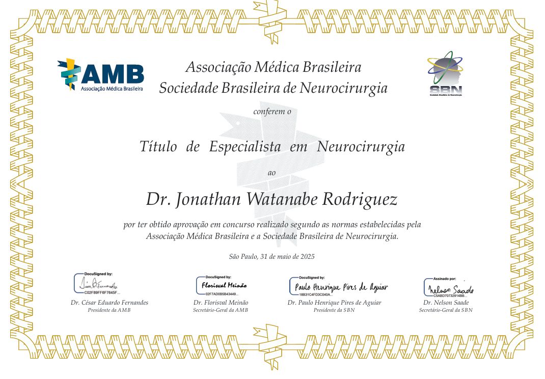 Jonathan Watanabe Rodriguez (CRM-SP 198.893; RQE 136.275) é médico neurocirurgião, graduado pela PUC-SP (2018), com Residência em Neurocirurgia pela Fundação Centro Médico de Campinas (2020–2025). É Membro Titular da Sociedade Brasileira de Neurocirurgia (SBN/AMB) e atualmente realiza Fellowship em Neurocirurgia Funcional e Terapia Antálgica no A.C. Camargo Cancer Center.