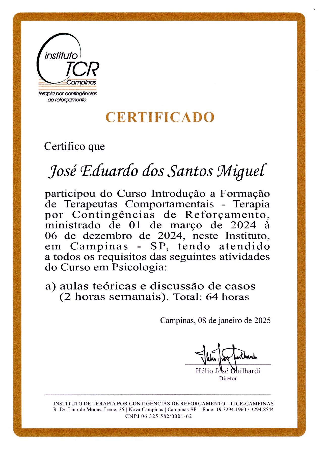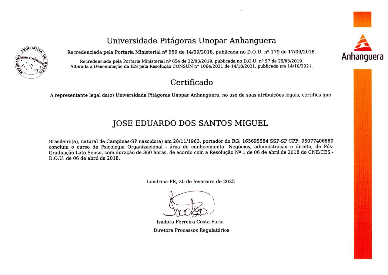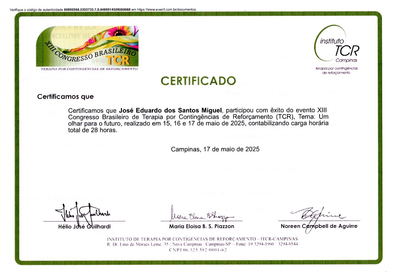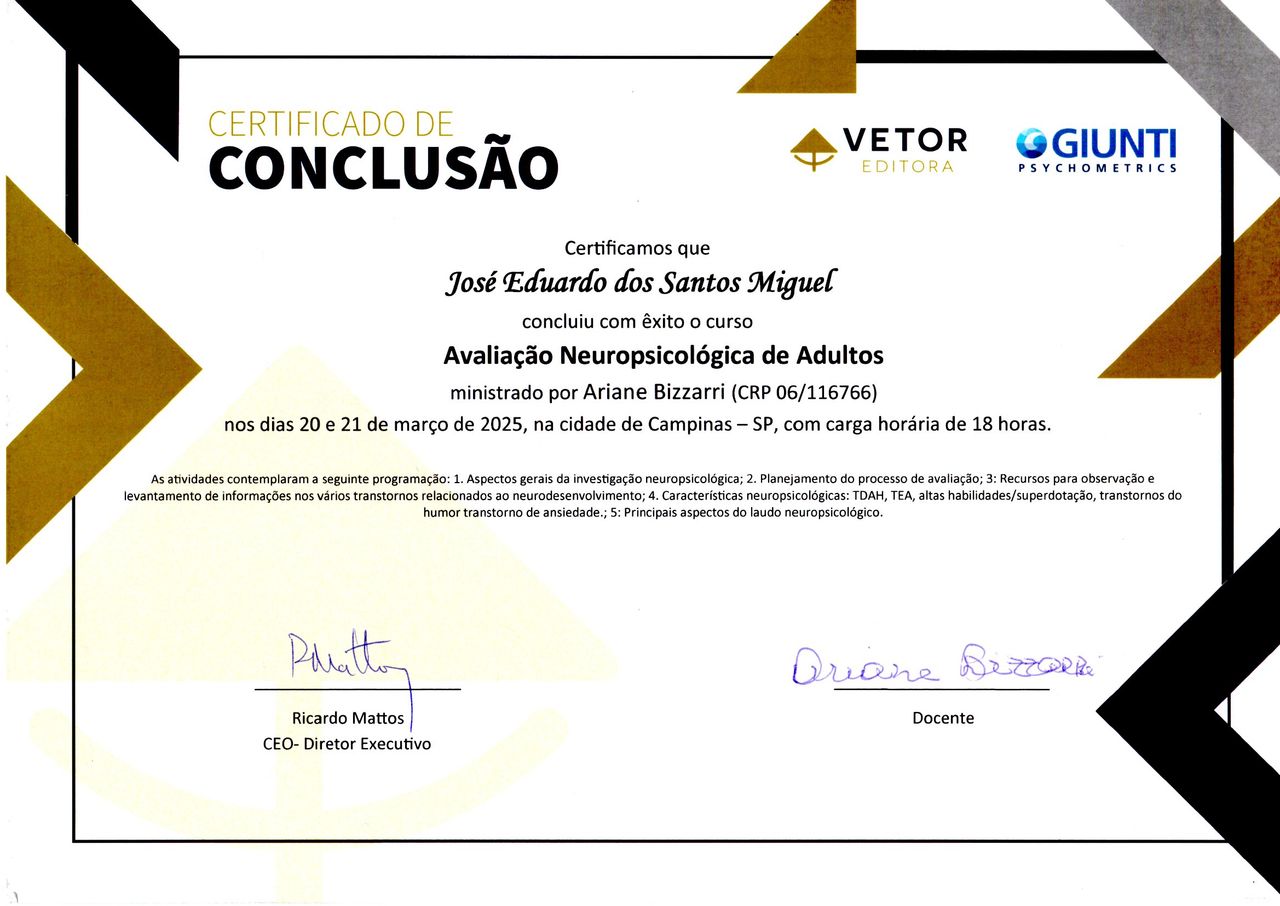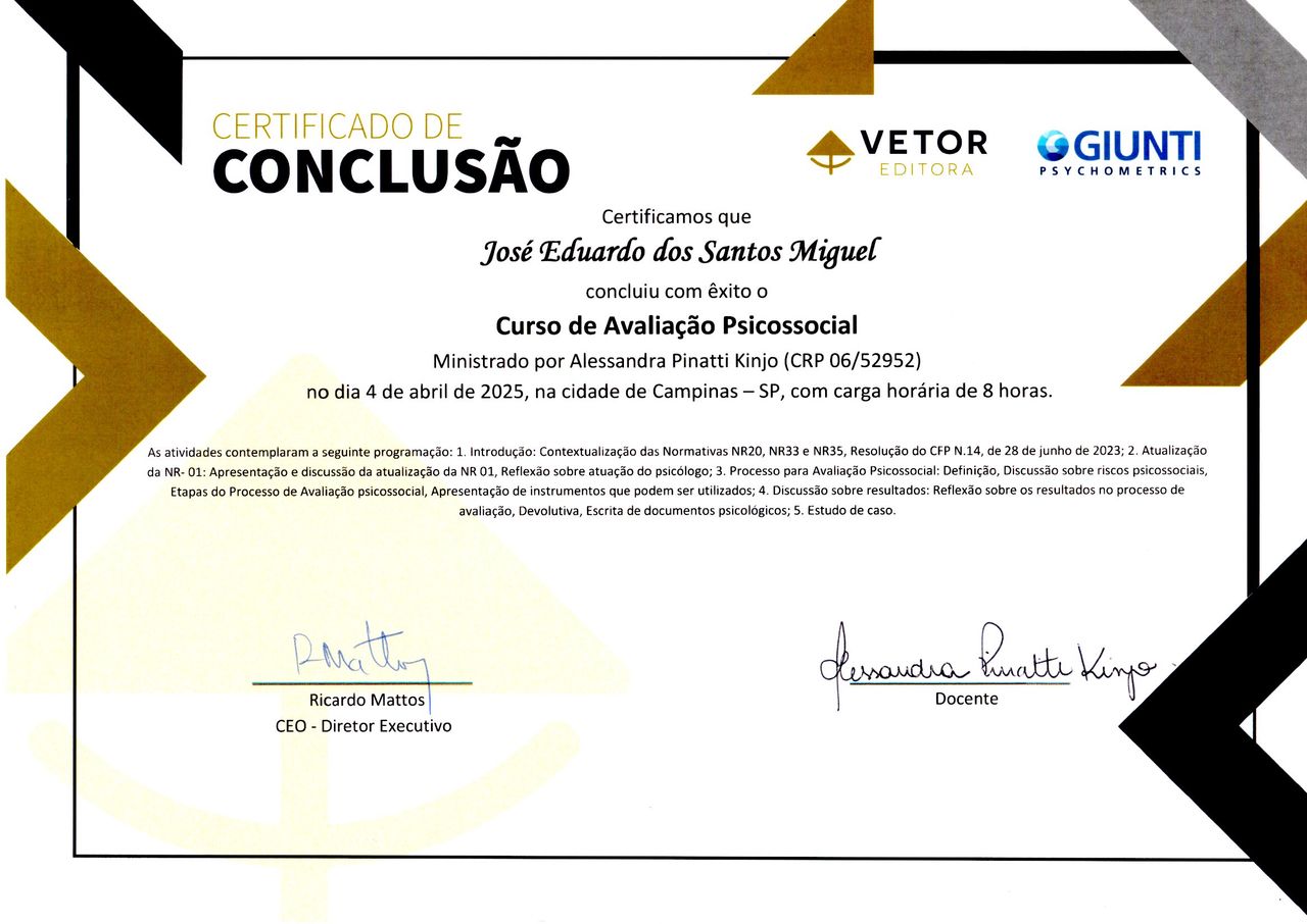 Minha formação é complementada por cursos em Avaliação Neuropsicológica de Adultos, Avaliação Psicossocial e Capacitação em Avaliação e Pesquisa dos Fatores de Riscos Psicossociais no Trabalho, além da Introdução à Formação de Terapeutas Comportamentais em Terapia por Contingências de Reforçamento (TCR). Também participo ativamente de congressos e eventos científicos voltados a essas áreas, mantendo-me sempre atualizado para oferecer atendimentos baseados em evidências.