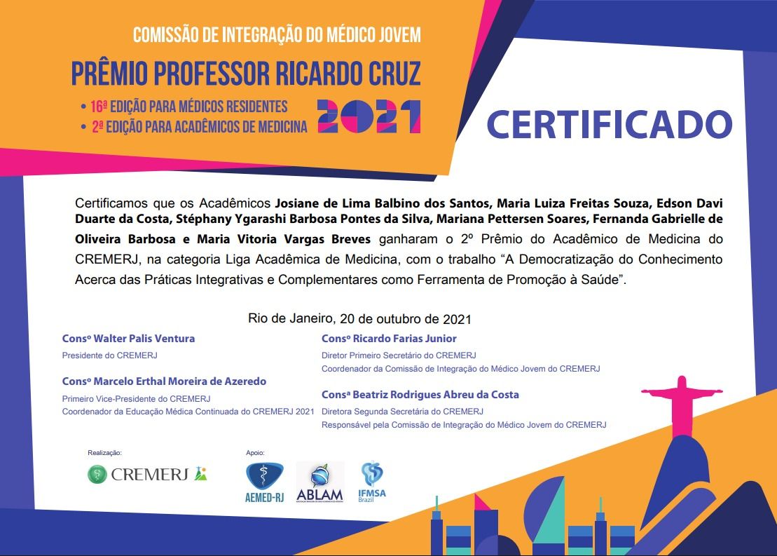 Amante da Pesquisa Cientíifica, sou autora de diversos trabalhos apresentados em congressos na área Médica, sendo alguns publicados em periódicos indexados. Em 2022 fui ao 2022 International Congress on Integrative Medicine and Health com subsídio integral de sua instituição de ensino.