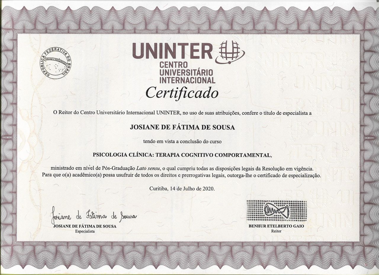 Sou a Psicóloga Josiane Sousa (CRP 08/15288), formada pela Faculdade Evangélica do Paraná, com especializações em Terapia Cognitivo-Comportamental (TCC), Terapia do Esquema e MBA em Relacionamento Humano Comportamental.