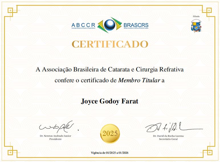 A Dra. Joyce Farat superou todas as minhas expectativas com todo processo envolvendo a minha cirurgia, eu tinha uma média de 7,50 de miopia e 3,50 de astigmatismo em cada olho e hoje enxergo perfeitamente bem, sou completamente agradecido pela qualidade de vida que ela me proporcionou.