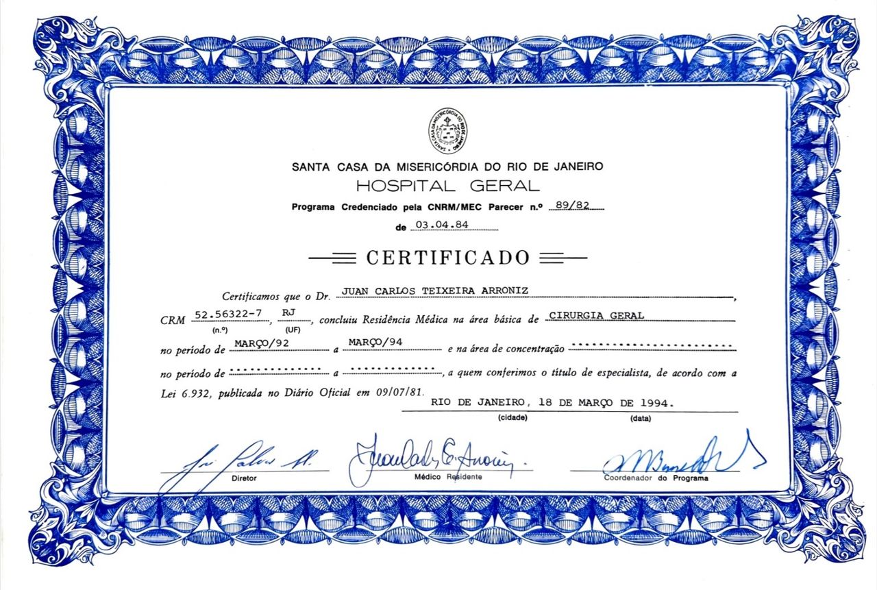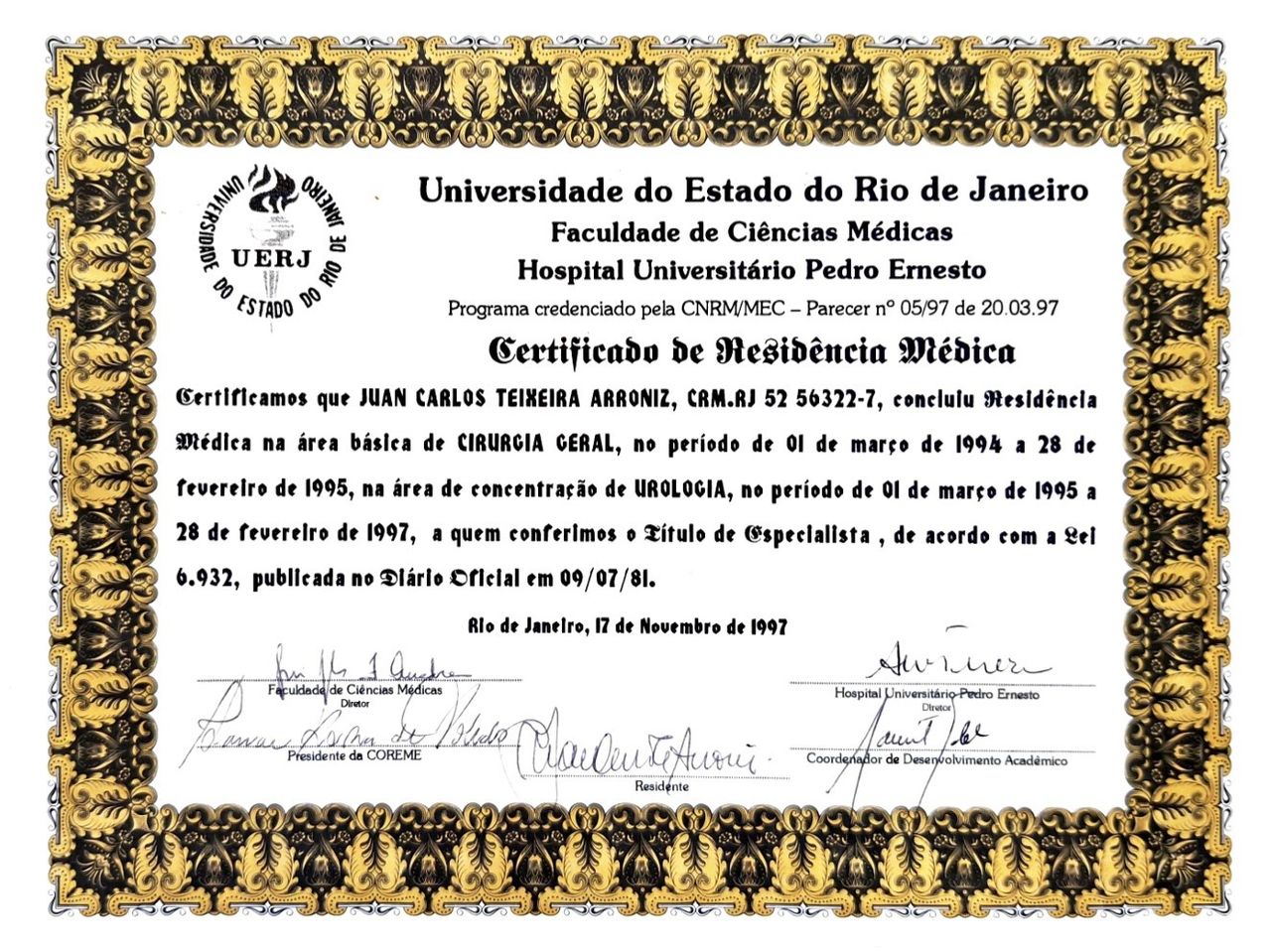 Especializado em Cirurgia Geral de 1991 a 1993, em regime de Residência Médica na Irmandade da Santa Casa de Misericórdia do Rio de Janeiro. Aprofundou seus conhecimentos e habilidades em Urologia de 1994 a 1997 no renomado Hospital Universitário do Estado do Rio de Janeiro UERJ.