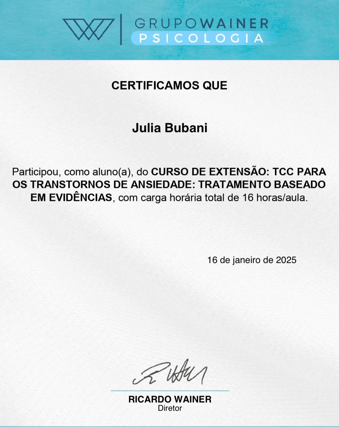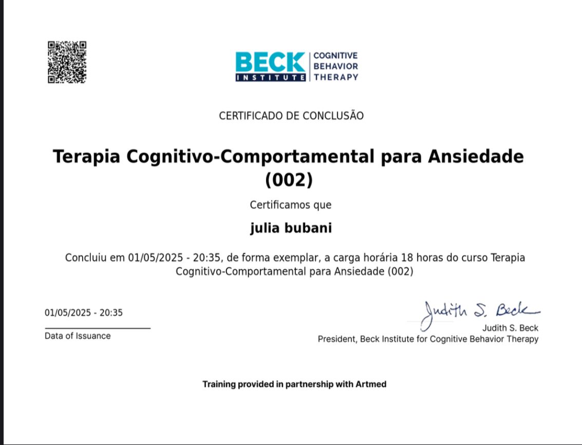 A confiança no profissional é muito importe pro sucesso do tratamento, e na saúde mental, muitas vezes chegamos cansados, angustiados e temerosos diante de tratamentos prévios falho. A paciência da Dra Júlia, tanto em escutar quanto ao montar um tratamento e acompanhamento que está dentro da realidade do paciente me impressionou, sua habilidade em não só se comprometer com a melhora inicial mas como no refinamento daquilo que precisa ser melhorado aos poucos e ao longo do tempo, são questões que realmente me deixa extremamente grata e feliz por ser sua paciente. Ao pensar em como cheguei na primeira consulta e como caminho hoje, só espero que quem precisa de ajuda também tenha a oportunidade de um tratamento tão humanizado e individualizado!!! Sem reclamações, só elogios! Muito obrigada por tudo Dra Júlia!