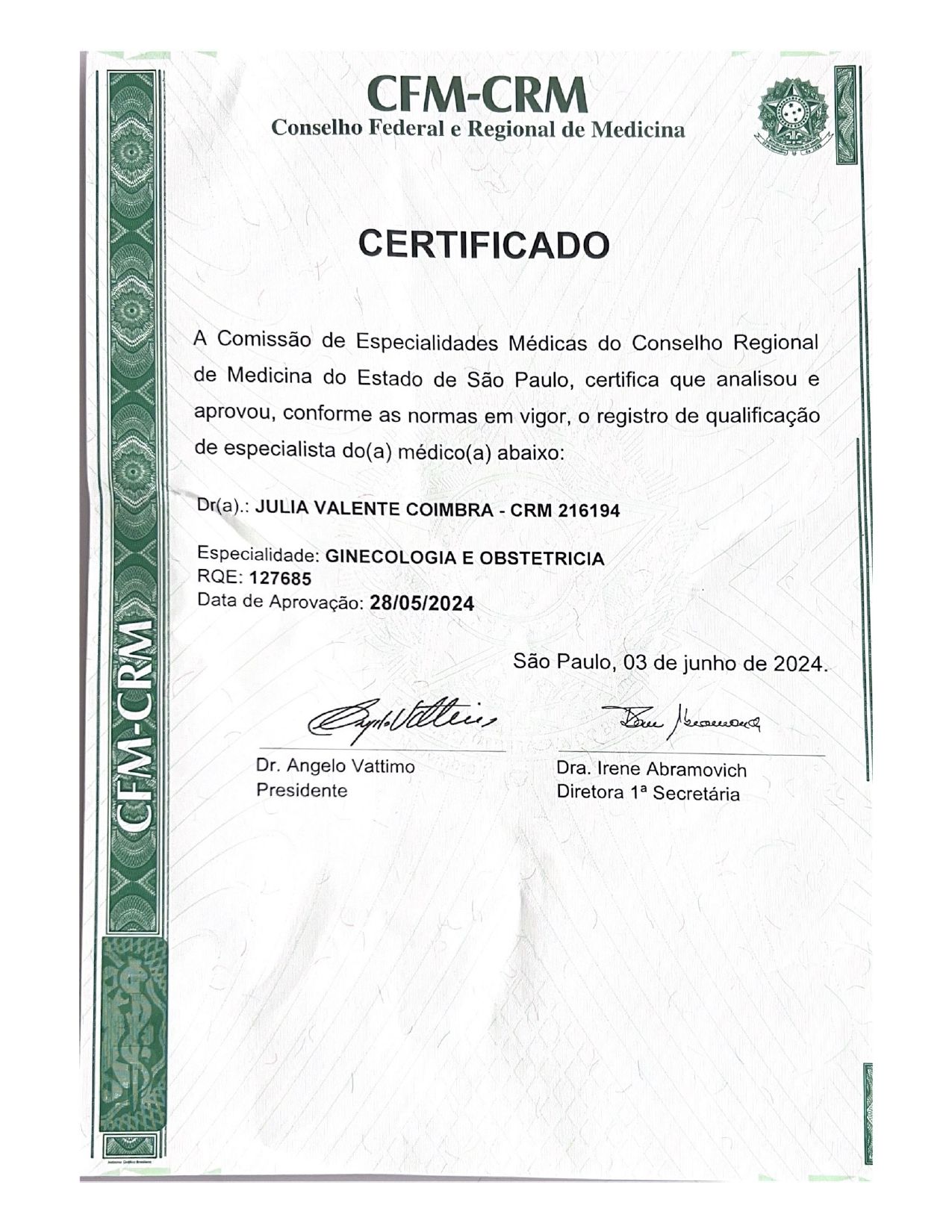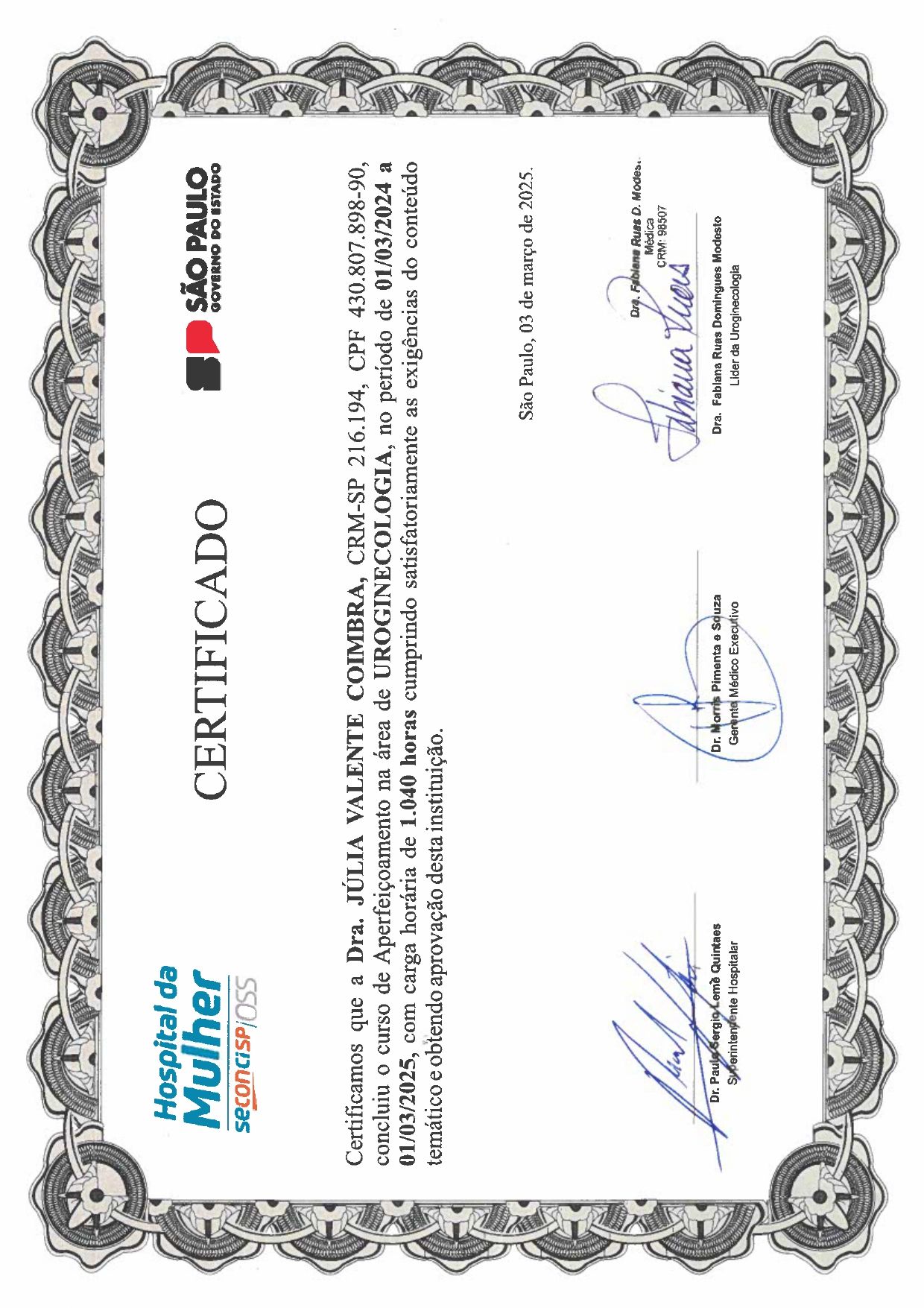 Quais são as principais especialidades de Júlia Coimbra?Júlia Coimbra é ginecologista. Te mostramos alguns dos serviços oferecidos pelo especialista graças à sua trajetória e vasta experiência: Tratamento infecção urinária de repetição, Consulta ginecológica, Correção de prolapso genital, Consulta ginecologia, Tratamento Cirurgico Da Incontinencia Urinaria Por Via Vaginal, Consulta para perda de urina e bexiga caída, Correção de prolapso com uso de telas sintéticas, Primeira consulta ginecologia, Anticoncepção, Uroginecologia.
