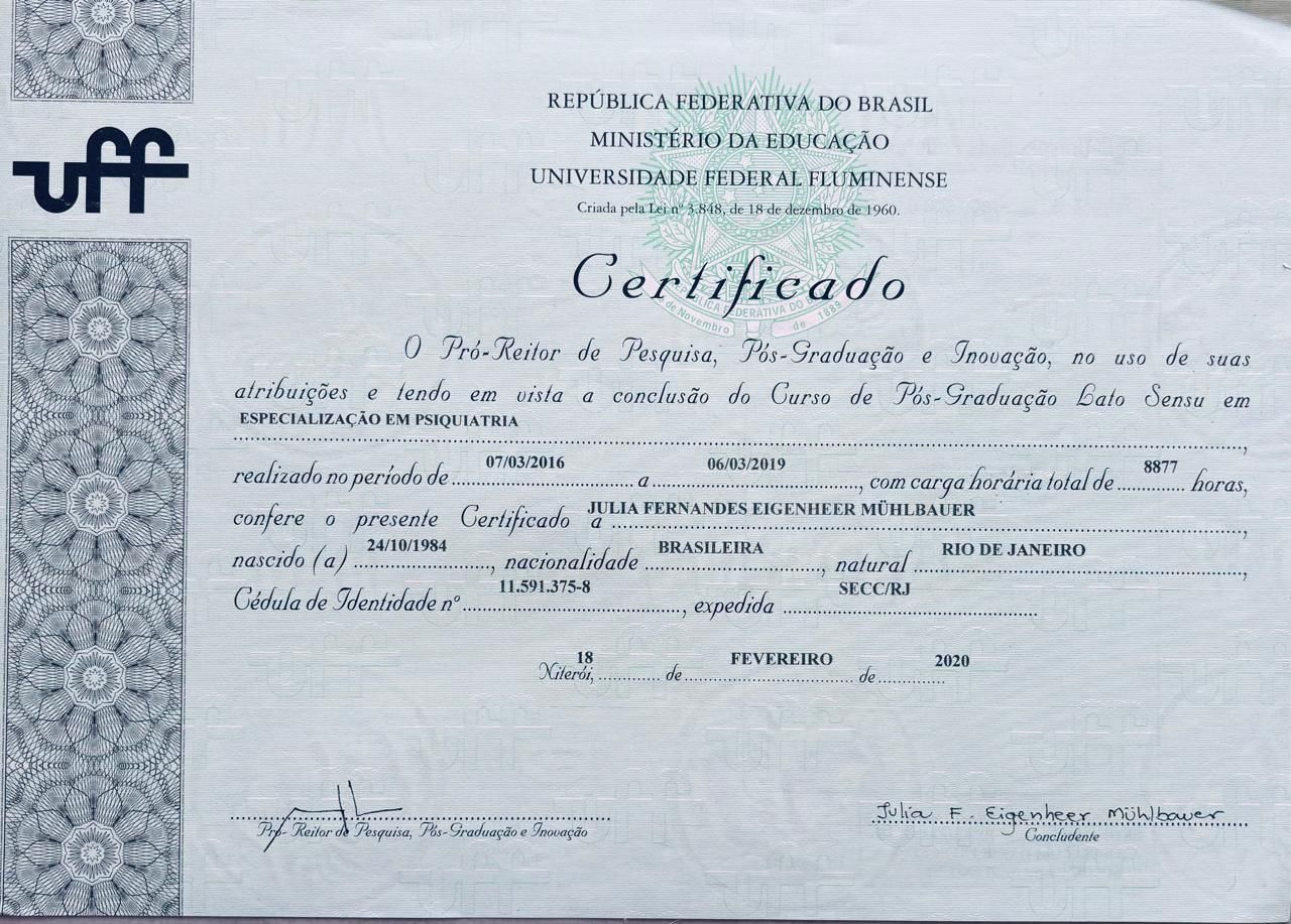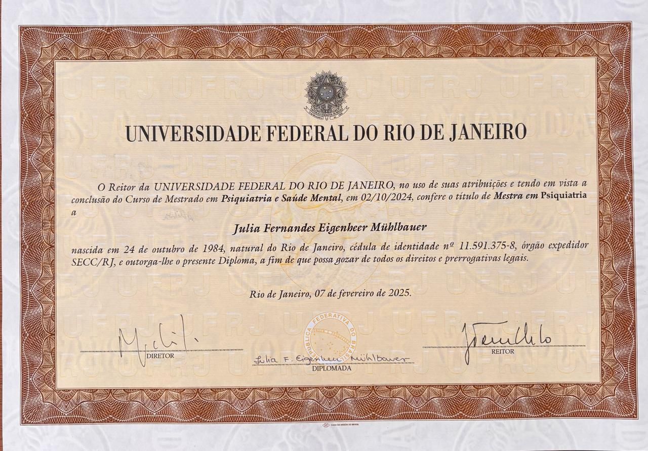Sou médica com residência em Clínica Médica, especialização em Psiquiatria pela Universidade Federal Fluminense e mestrado em Psiquiatria e Saúde Mental pela Universidade Federal do Rio de Janeiro. Também tive a oportunidade de realizar um observership no serviço de Psiquiatria do Hospital Sunshine, em Victoria, Austrália.