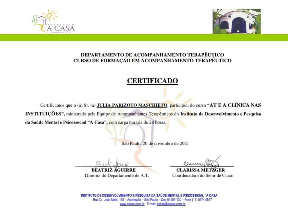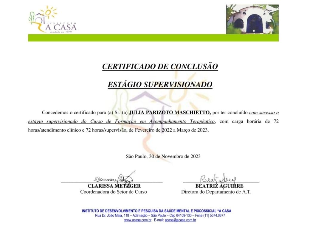 Sou também Acompanhante Terapêutica, formada pelo Instituto A Casa. Além da clínica psicanalítica, possuo ampla vivência institucional nos campos da saúde, da assistência e da educação, com experiência no trabalho com autismo, bipolaridade, esquizofrenia, fibromialgia e outras questões de saúde mental, bem como no acompanhamento de vítimas de violência de gênero e racial.