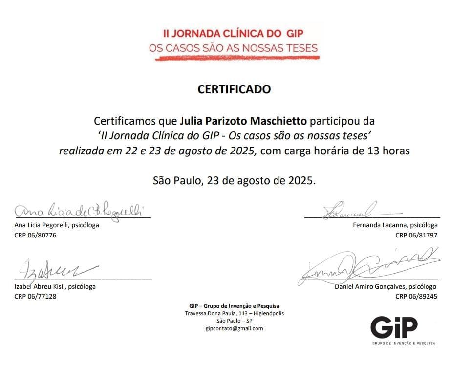 Quais são as principais especialidades de Julia Maschietto?Julia Maschietto é psicólogo. Te mostramos alguns dos serviços oferecidos pelo especialista graças à sua trajetória e vasta experiência: Primeira consulta psicologia, Psicoterapia, Consulta Psicologia, Teleconsulta, Tratamento da ansiedade, Consulta psicológica do adulto, Psicoterapia adulto, Consulta psicológica do adolescente, Psicoterapia Psicanalítica, Tratamento da depressão.