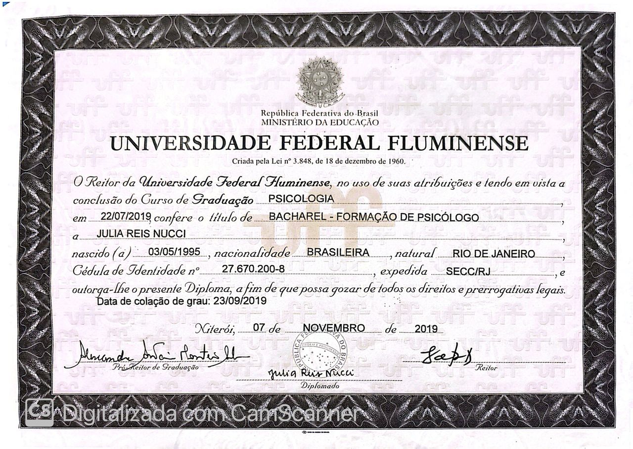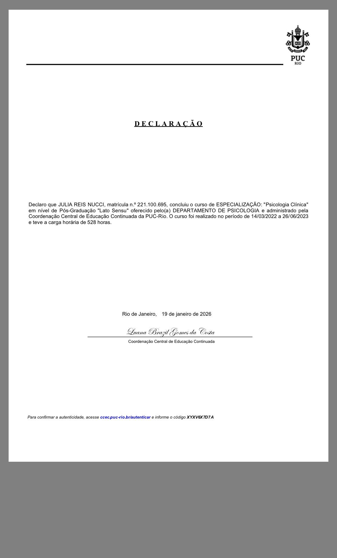 Olá, sou Júlia, Psicóloga formada pela Universidade Federal Fluminense desde 2019 e especialista em Psicologia Clínica pela PUC-Rio desde 2023.