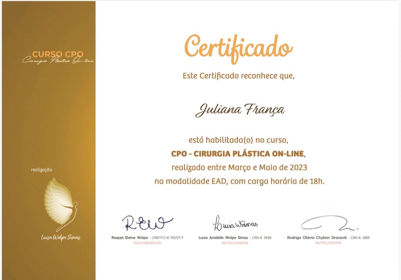 Quais são as principais especialidades de Juliana França?Juliana França é nutricionista. Te mostramos alguns dos serviços oferecidos pelo especialista graças à sua trajetória e vasta experiência: Primeira consulta Nutrição, Acompanhamento nutricional no pré e pós-cirúrgico, Teleconsulta, Acompanhamento nutricional no pré e pós-operatório da cirurgia bariátrica, Acompanhamento Pré Bariátrica, Acompanhamento nutricional pré e pós balão intragástrico, Atendimento para cirurgia bariátrica.